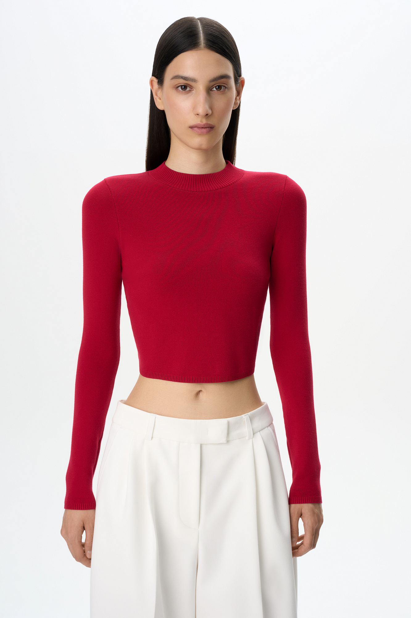 Трикотажный кроп-топ из вискозы с длинным рукавом, круглым вырезом горловины и фигурным низом. Края изделия выполнены в рубчик.