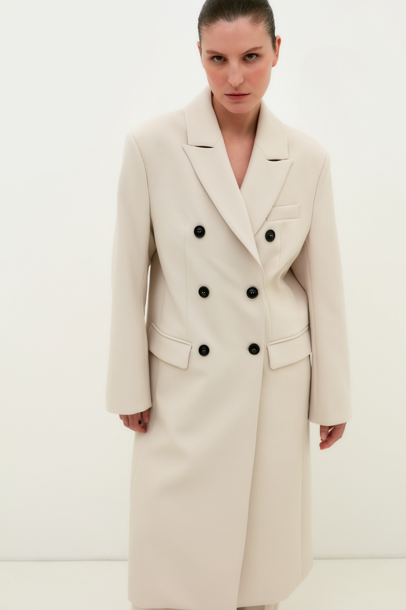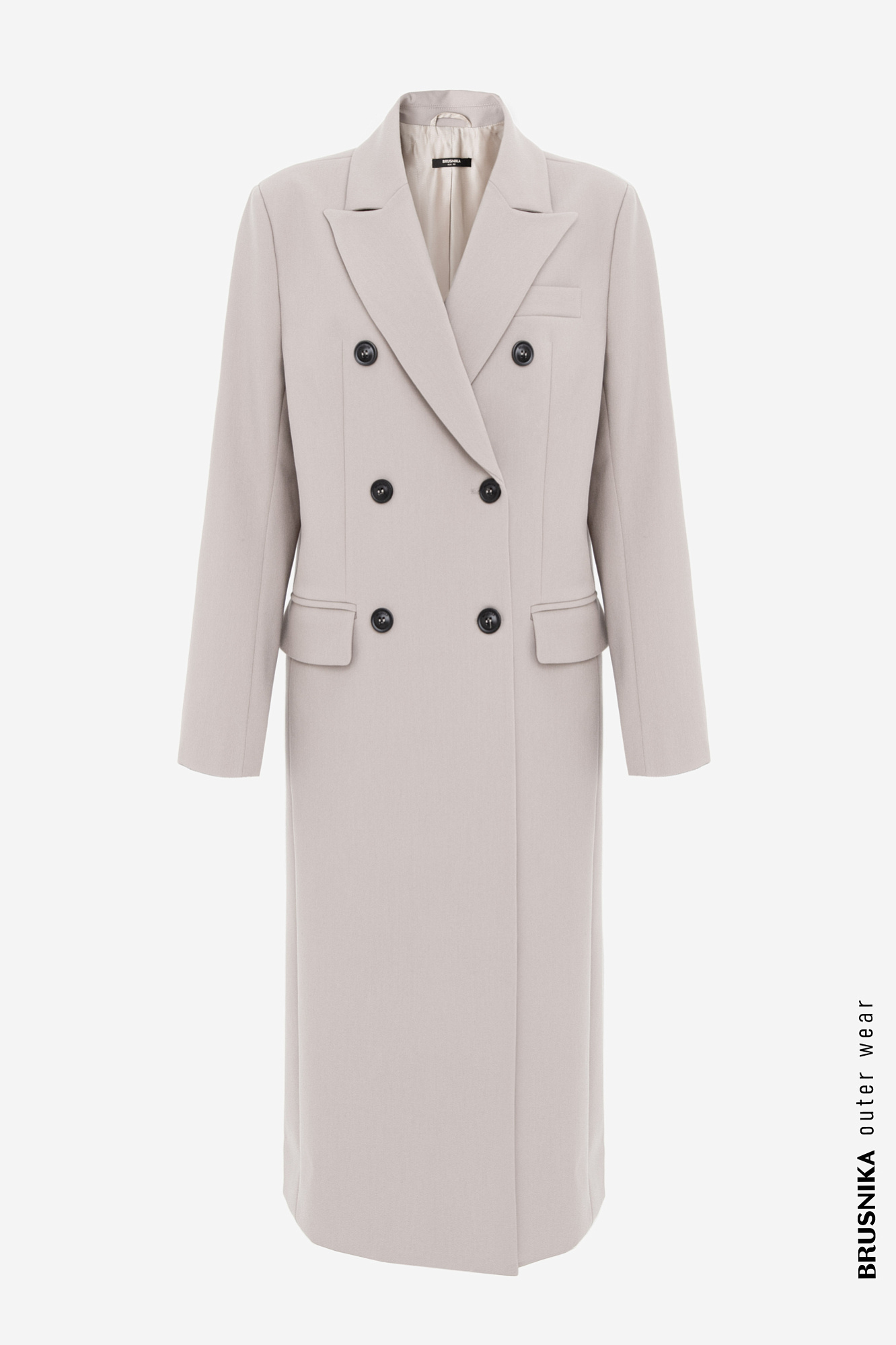 Двубортное тонкое пальто из поливискозы с карманами по бокам. Застежка на пуговицы.