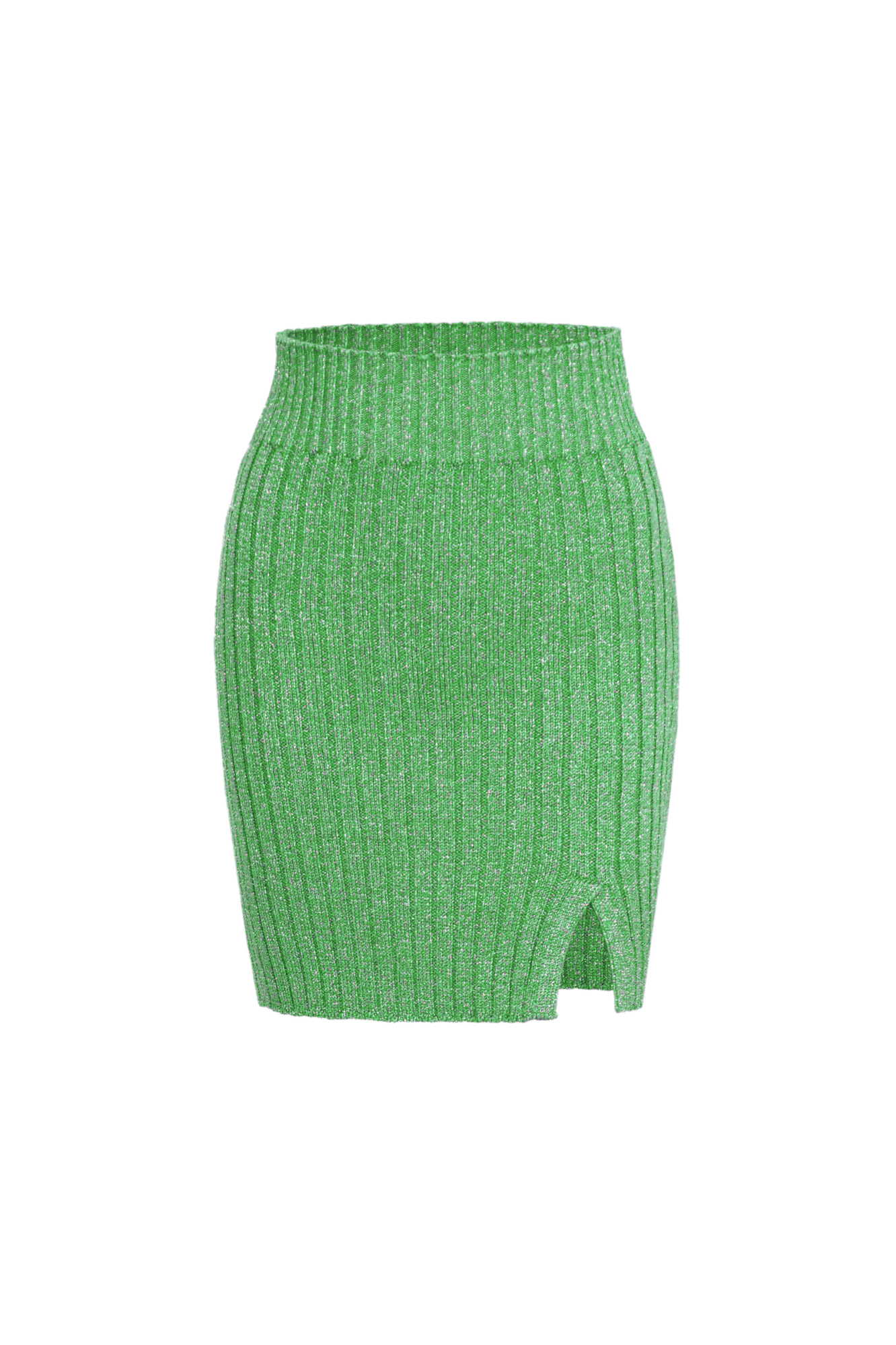 Юбка длины мини из вискозы с добавлением люрекса. Модель приталенного силуэта с широким эластичным поясом и разрезом спереди. Дополнить образ можно топом в таком же стиле.