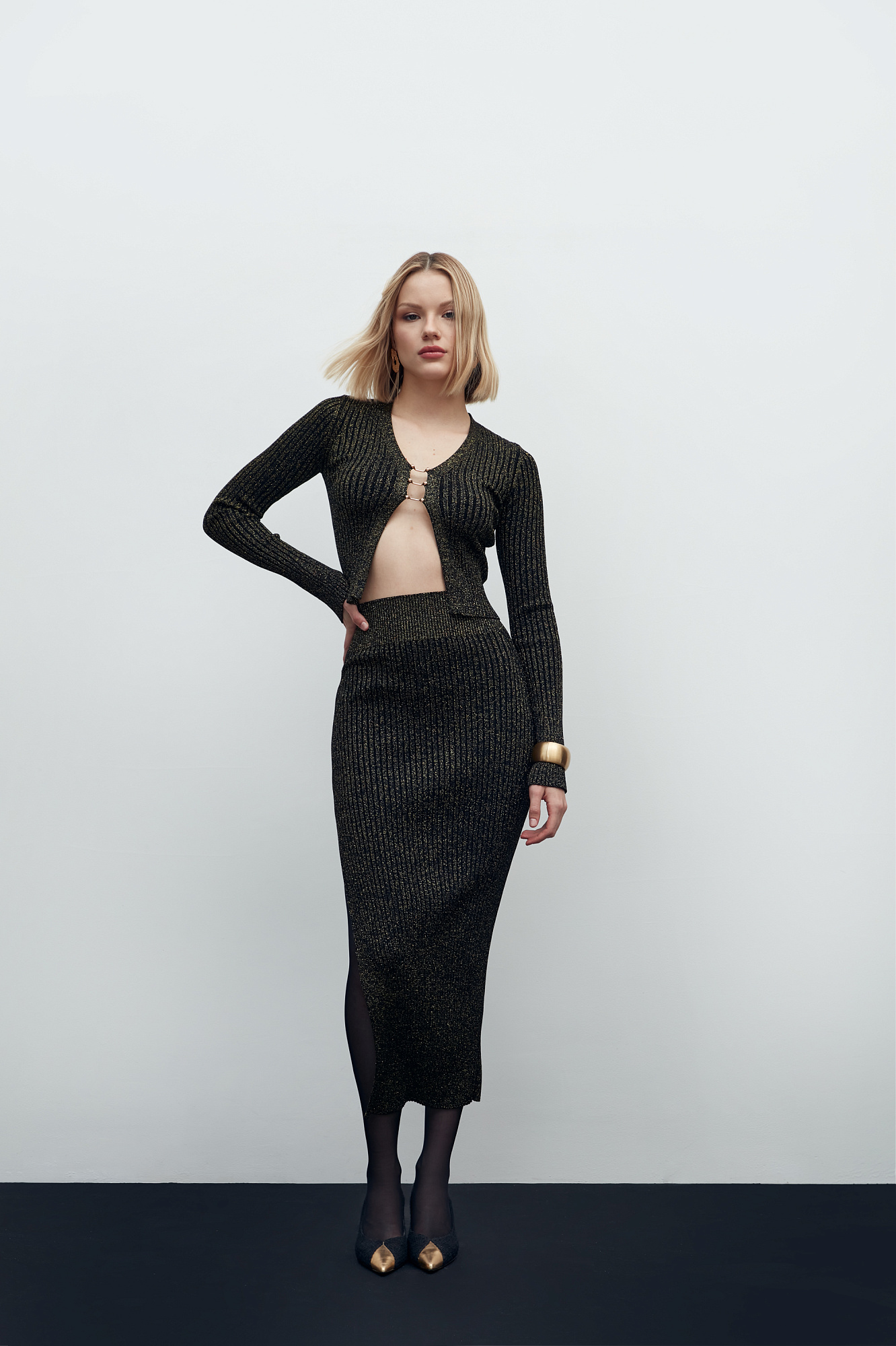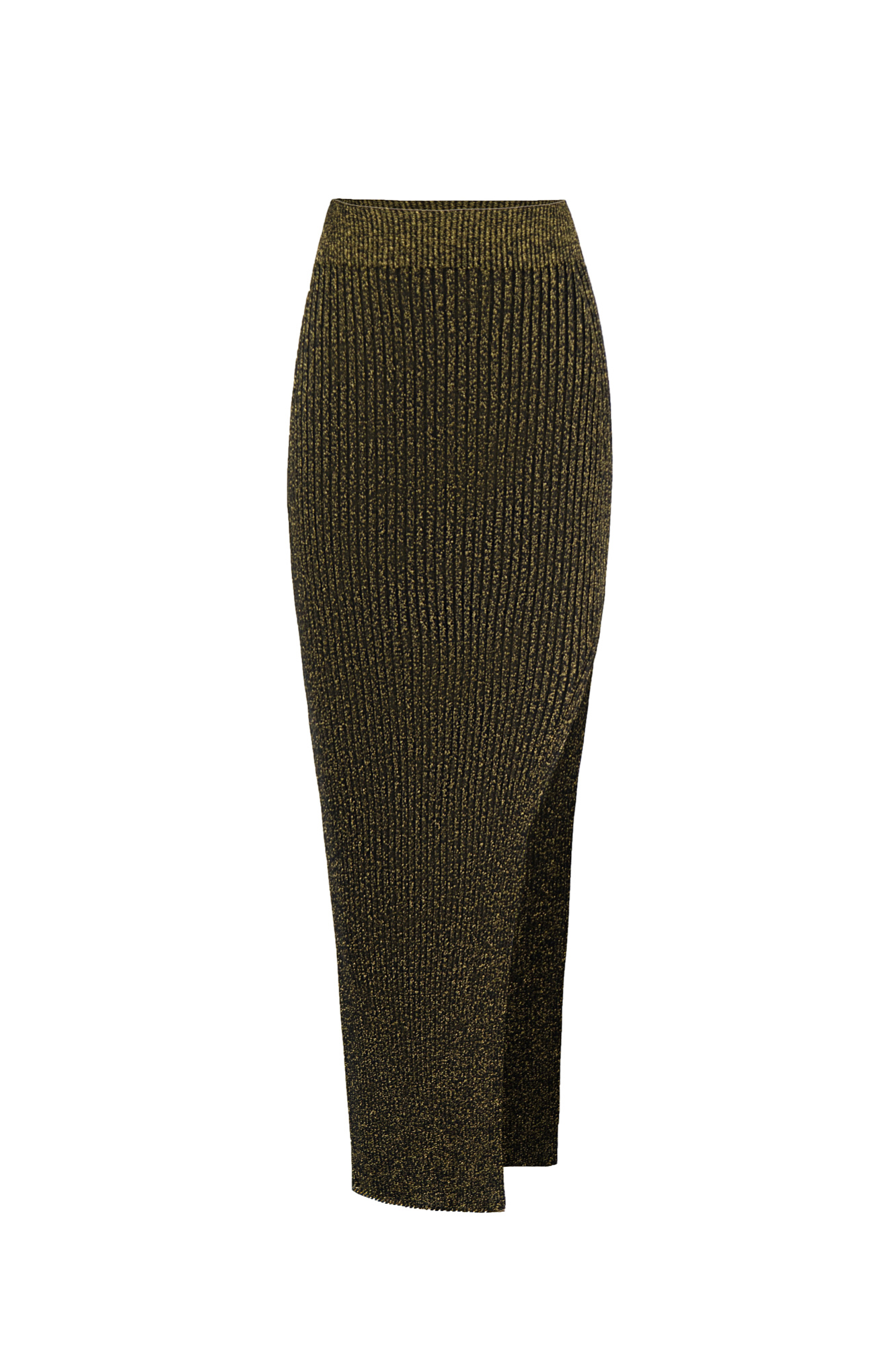 Трикотажная юбка длины миди из вискозы. Модель приталенного силуэта с разрезом сбоку и широким эластичным поясом.