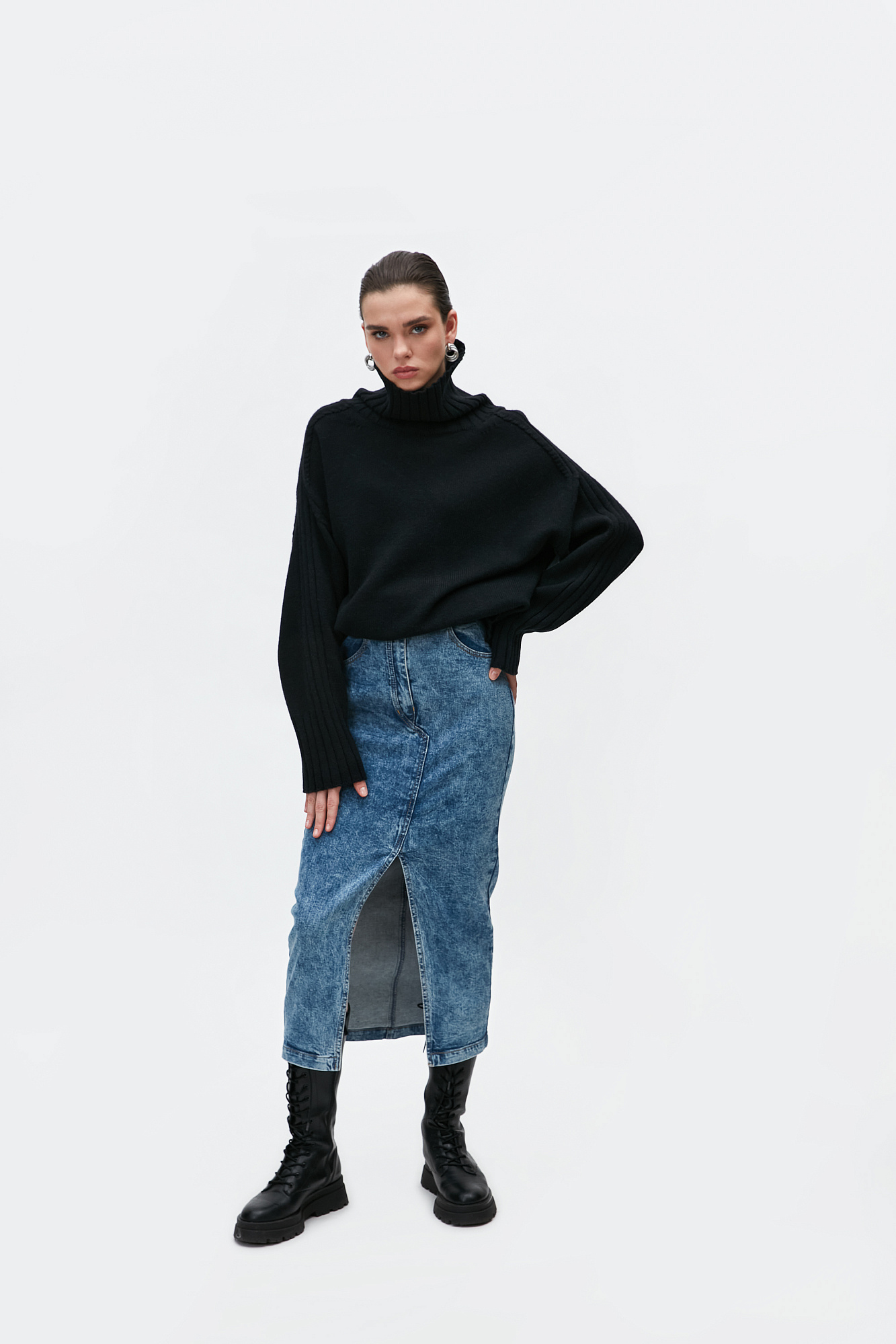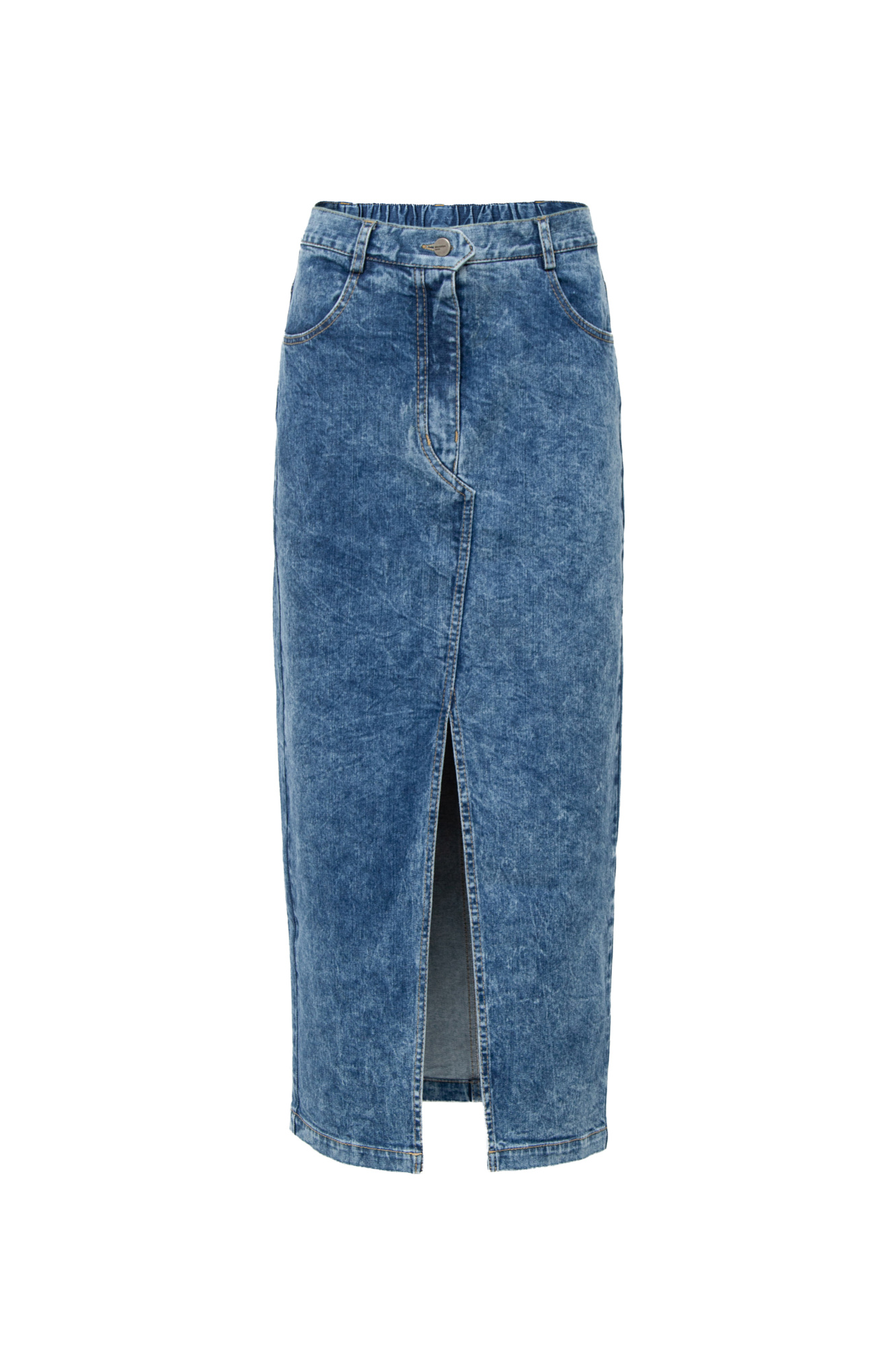 Джиносовая юбка длины миди из хлопка. Модель прямого кроя с разрезом спереди, патами на поясе для ремня и карманами. Застежка на молнию и пуговицу.