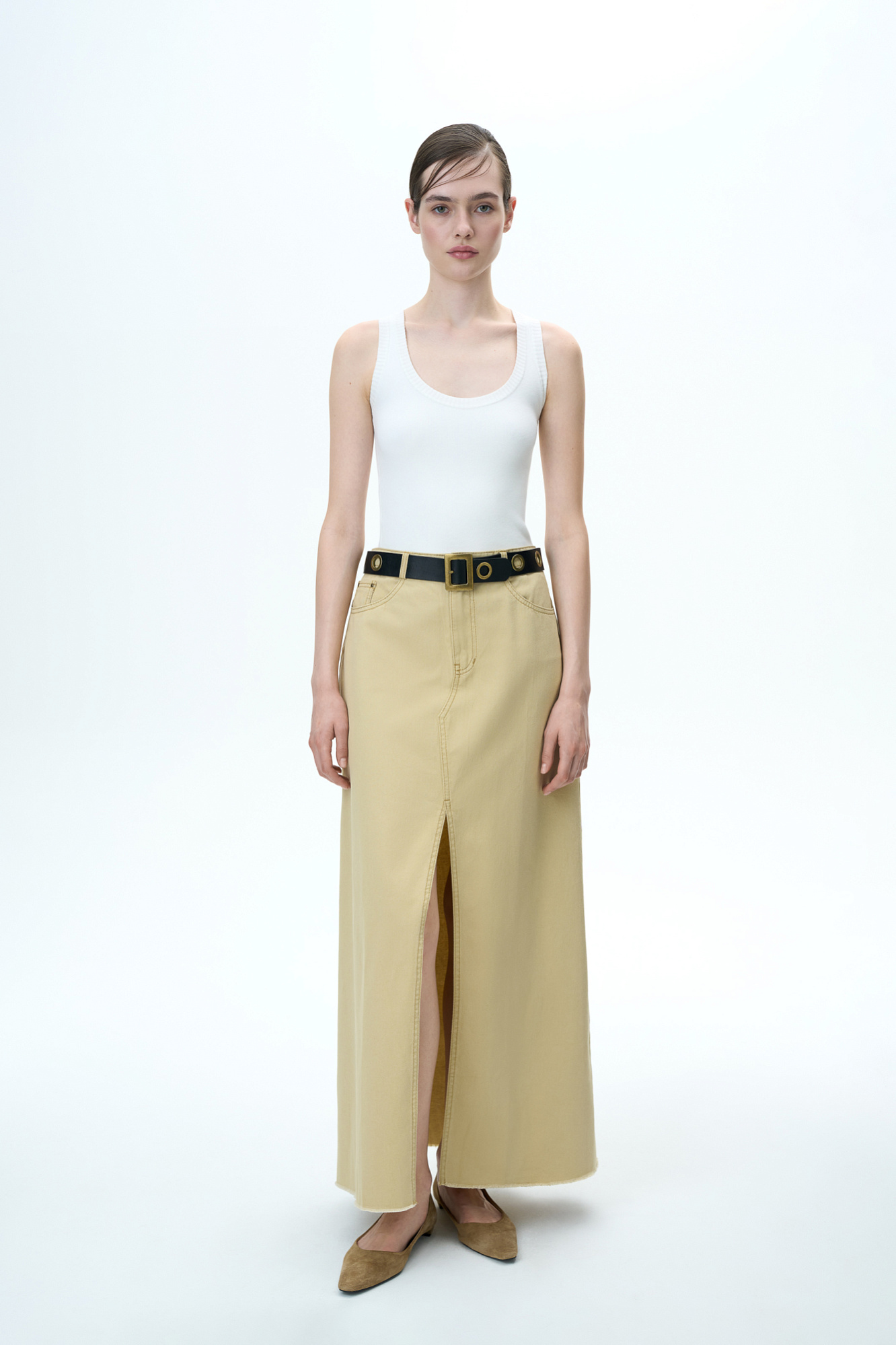 Джинсовая юбка длины макси из 100% хлопка. Модель со средней посадкой, с разрезом спереди и необработанным низом. Застежка на молнию и пуговицу.