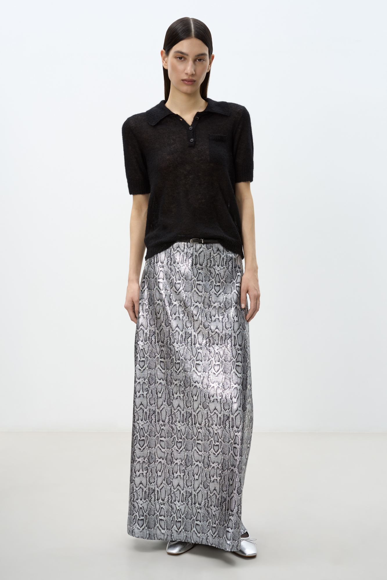 Юбка длины макси из текстурной ткани с анималистичным принтом, имитирующим чешую змеи. Изделие декорировано небольшими пайетками. Модель прямого силуэта. Застежка на молнию. На подкладке.