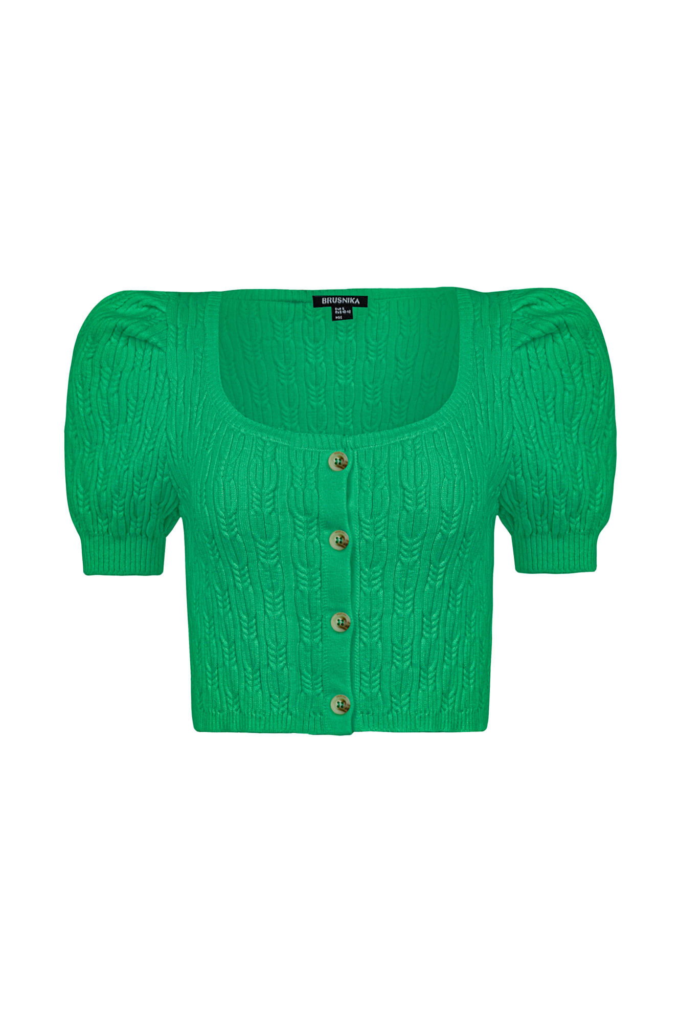 Трикотажный топ из хлопка с добавлением вискозы. Короткие рукава-фонарики и застежка на пуговицах.
