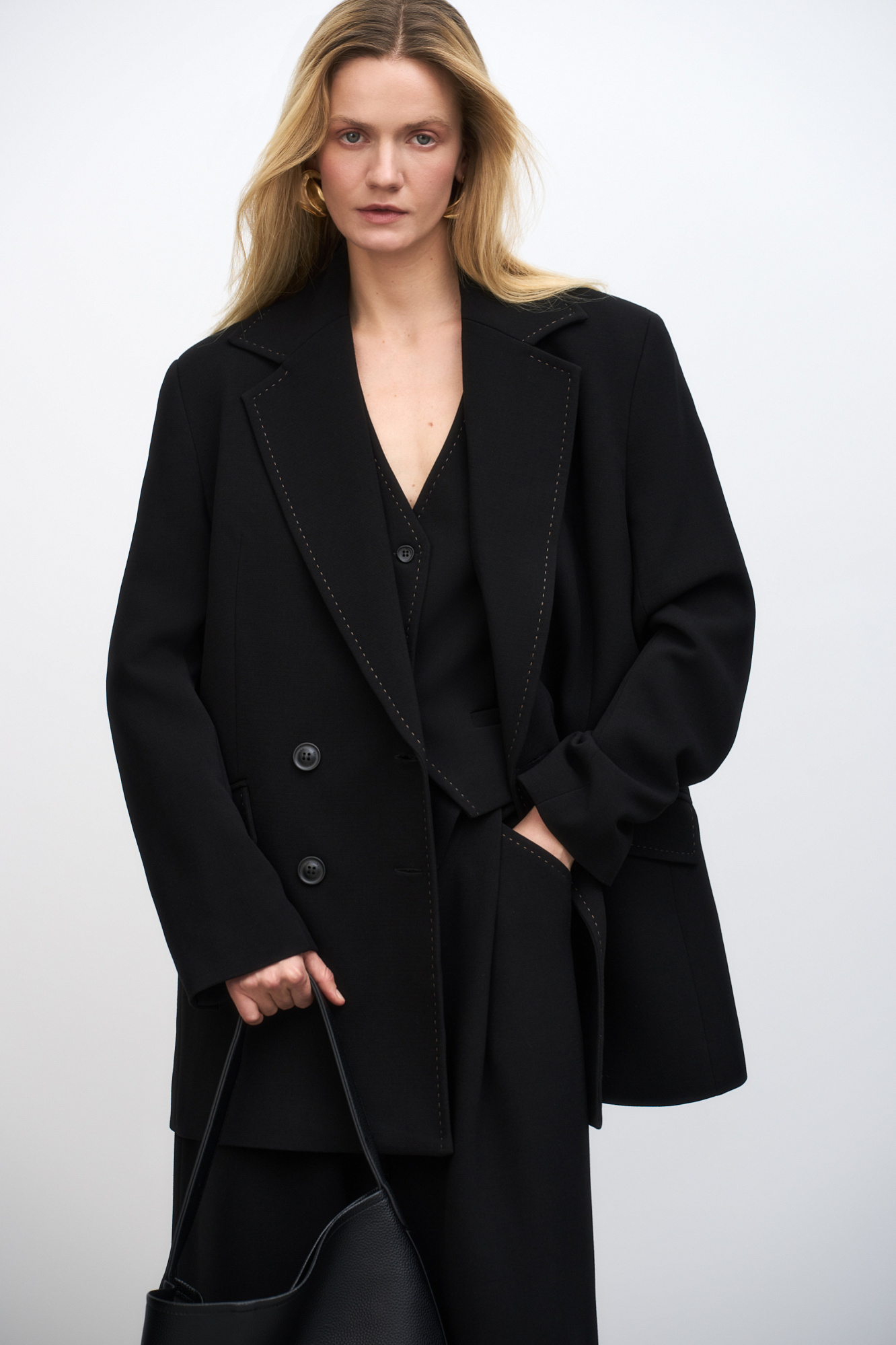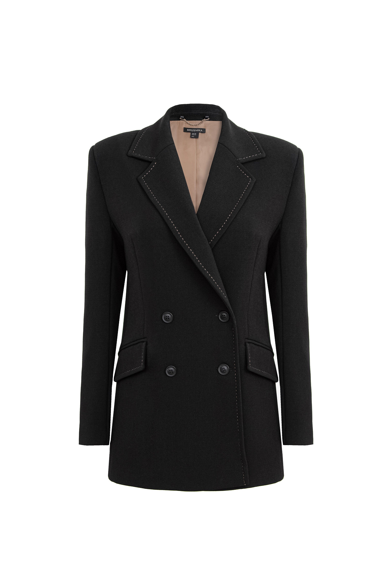 Приталенный двубортный жакет из вискозы с отстрочой и боковыми карманами. Дополнить образ можно брюками и жилетом.