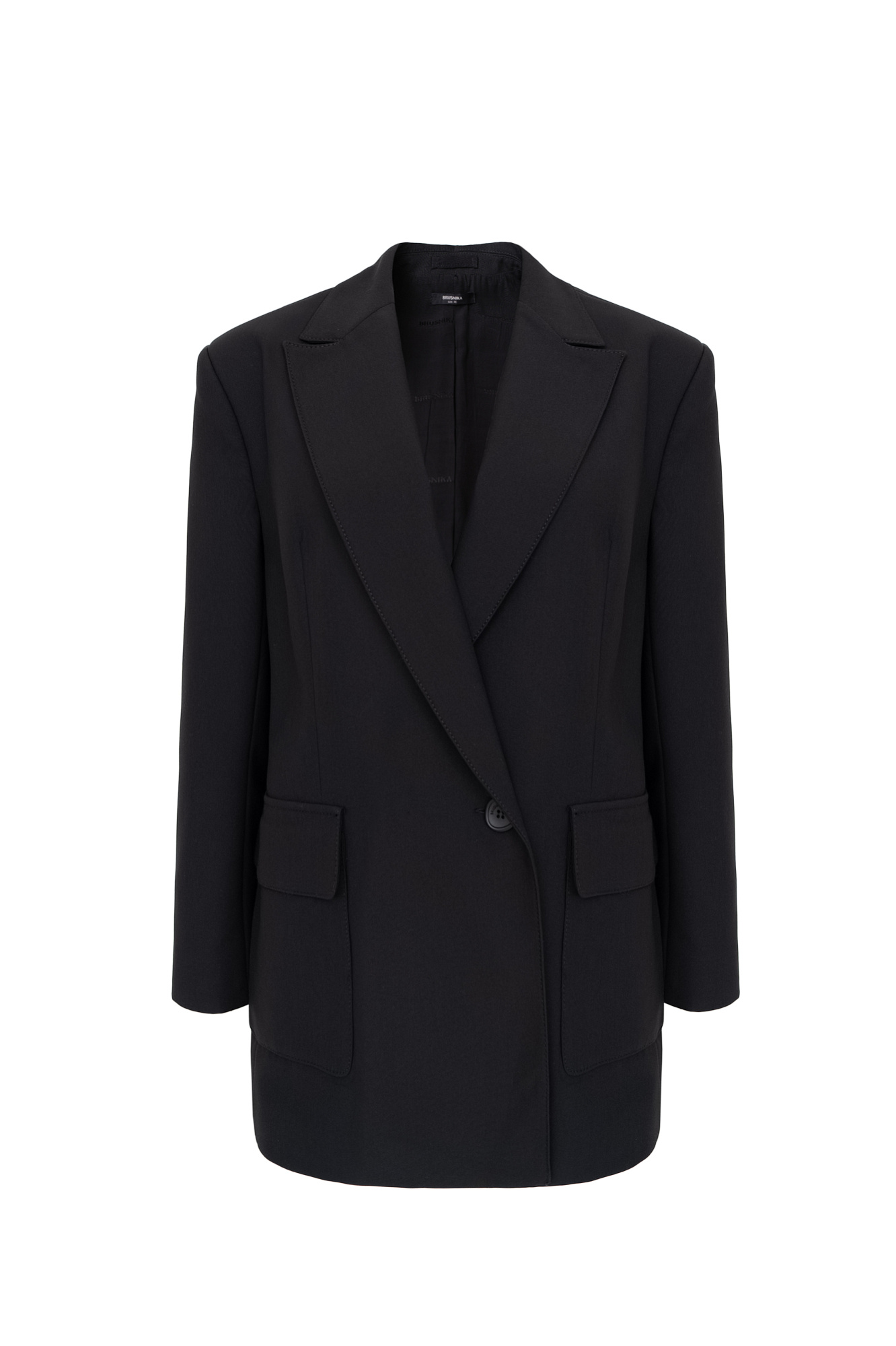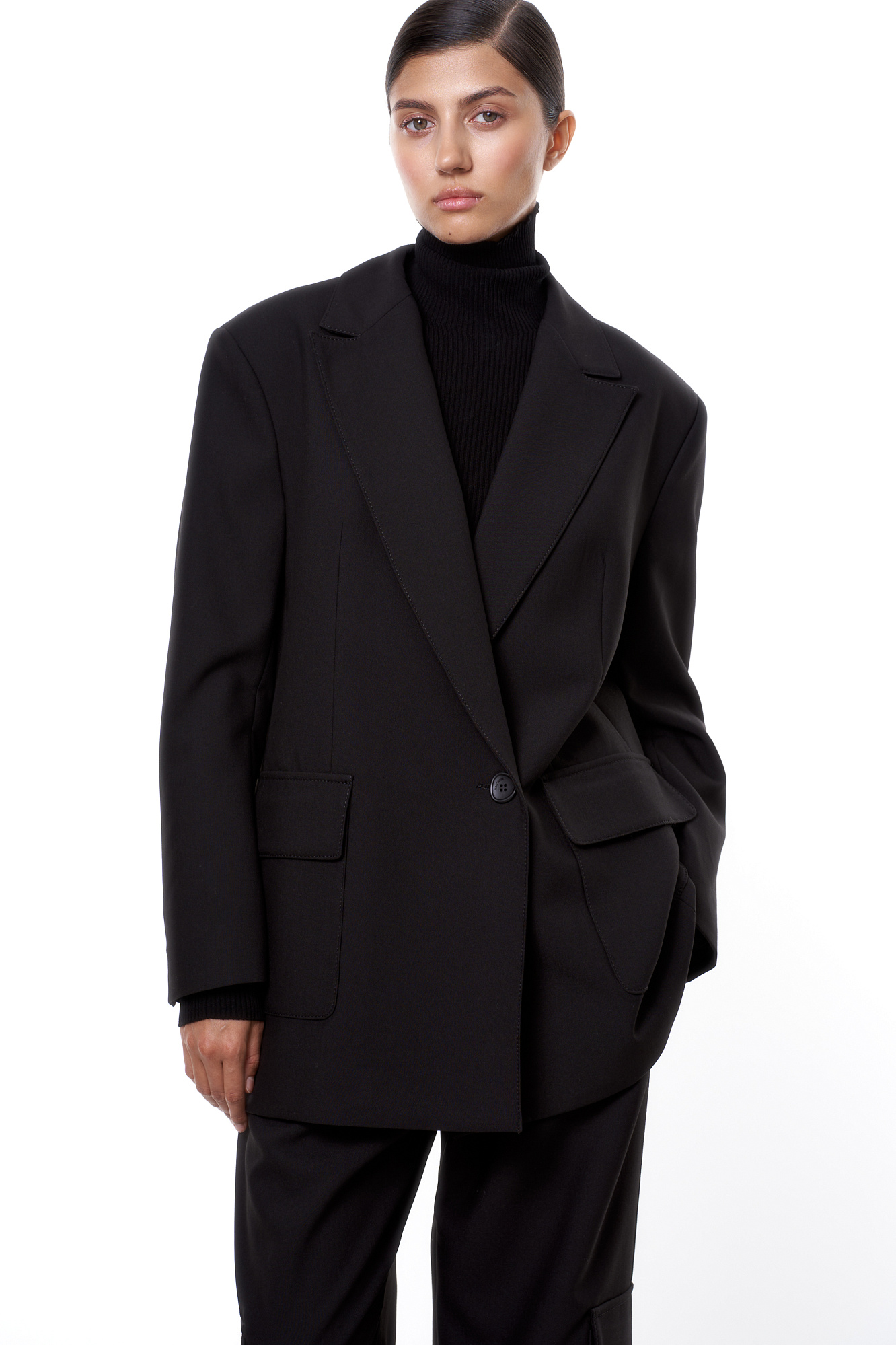 Жакет прямого силуэта из поливискозы, с накладными карманами, застежка на пуговицу.