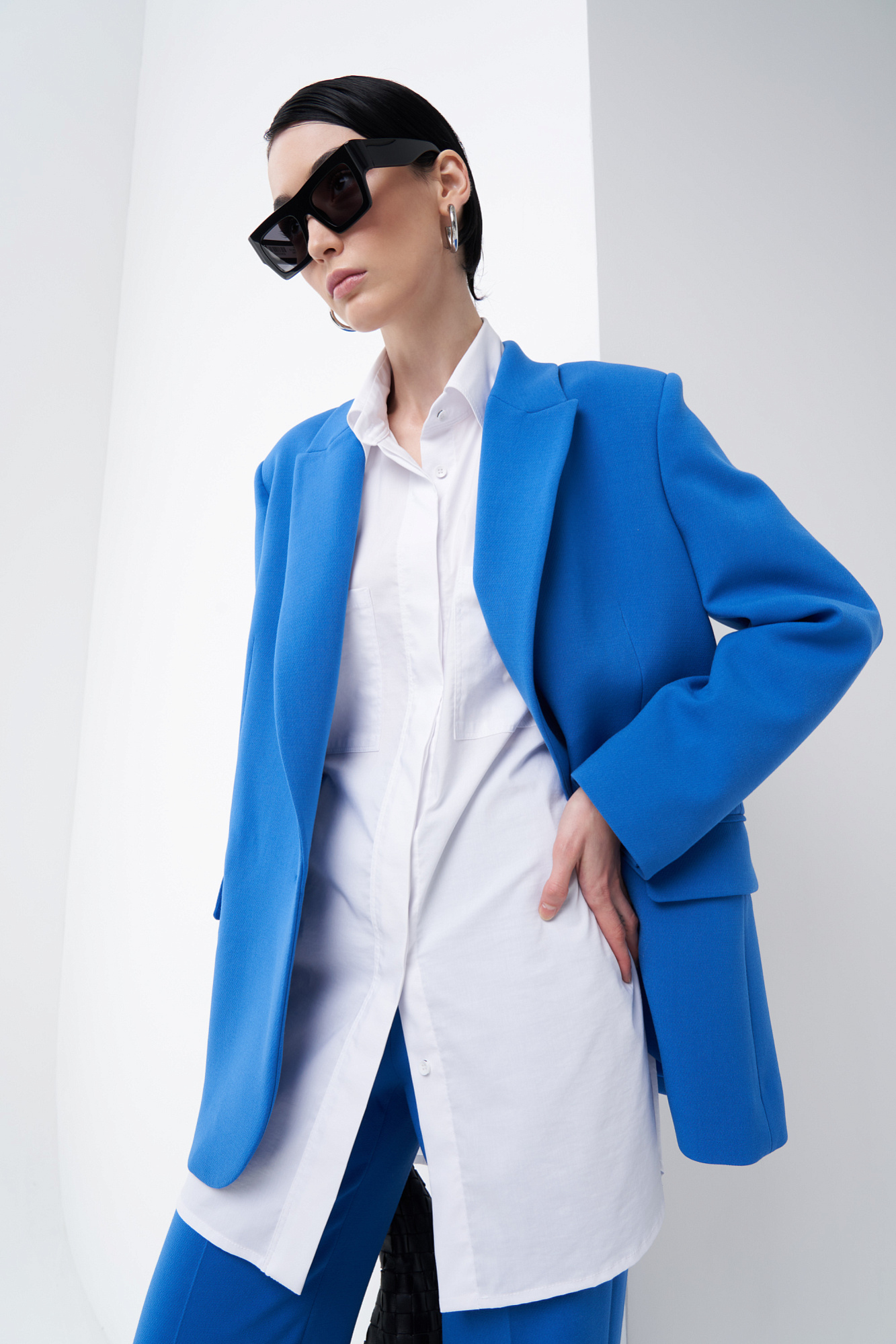 Свободный однобортный жакет с широкими лацканами, комфортными длинными рукавами с пуговицами на манжетах, а также застежкой на крупную пуговицу. Для создания комплекта сочетайте его с соответствующими брюками.