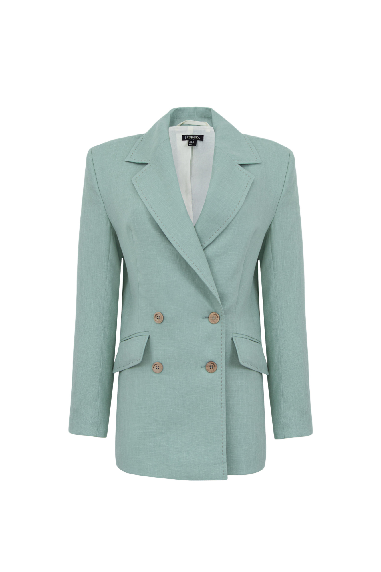 Классический двубортный жакет из 100% льна. Модель прямого кроя с английским воротником и прорезными карманами с клапанами. Изделие декорировано отстрочкой контрастного цвета. На подкладке.