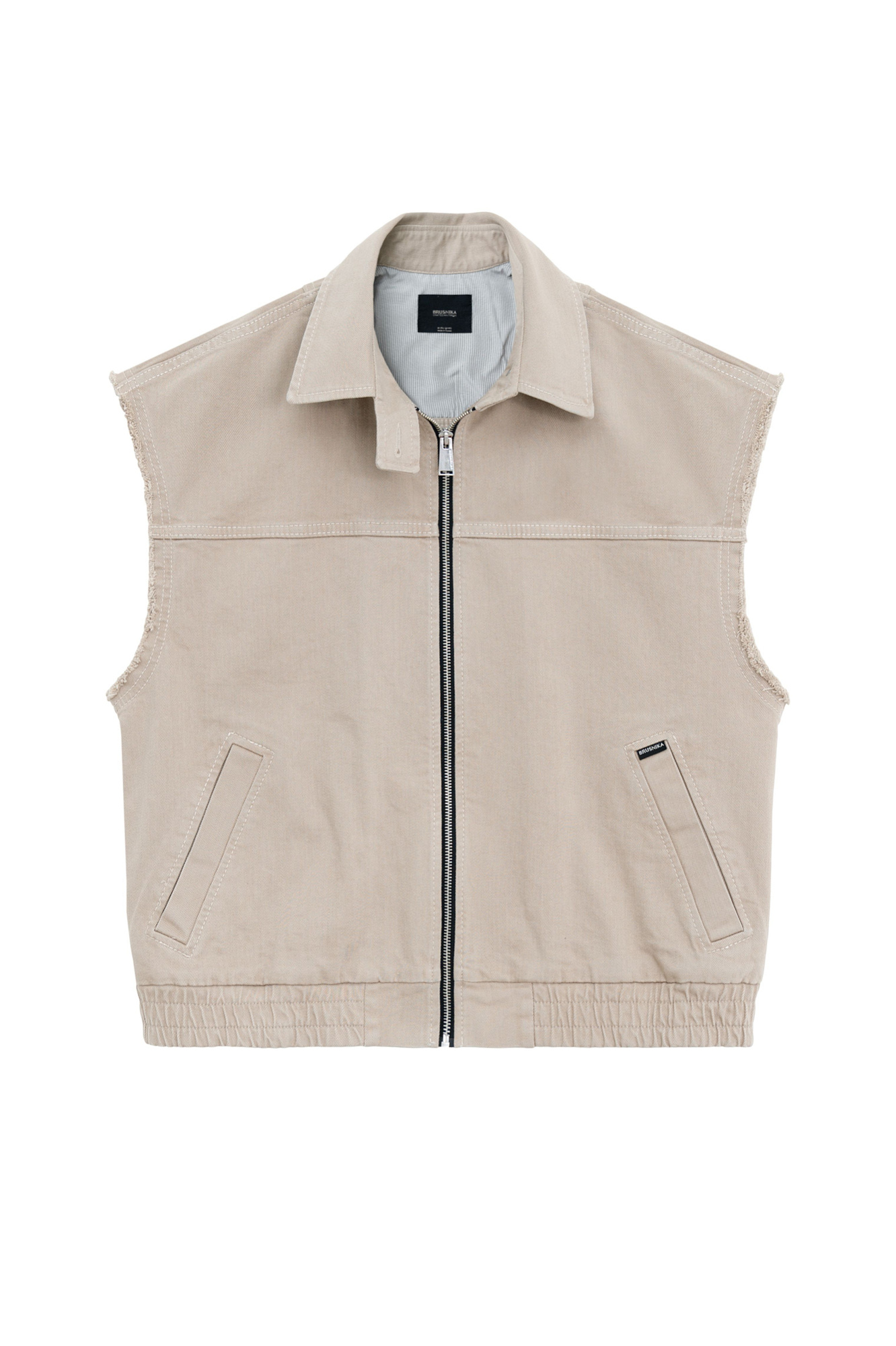 Жилет из денима с необработанными краями. Модель свободного силуэта с боковыми карманами и брендированным ярлыком. Застежка на молнию. Дополнить образ можно джинсами в таком же стиле.