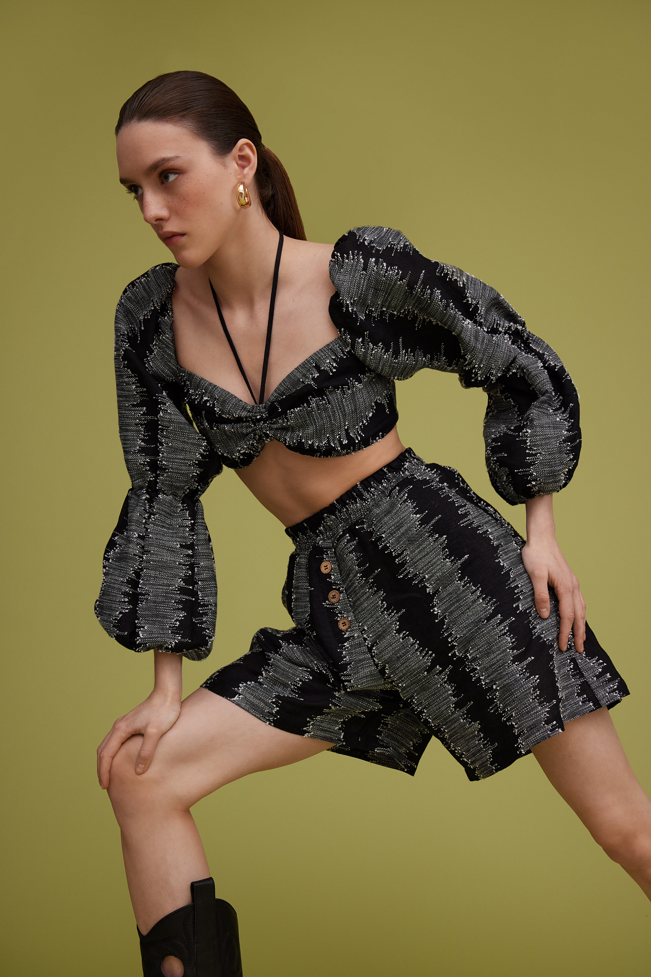 Шорты из текстурного льна. Модель прямого кроя с поясом на резинке, двумя карманами и декором в виде пуговиц.
