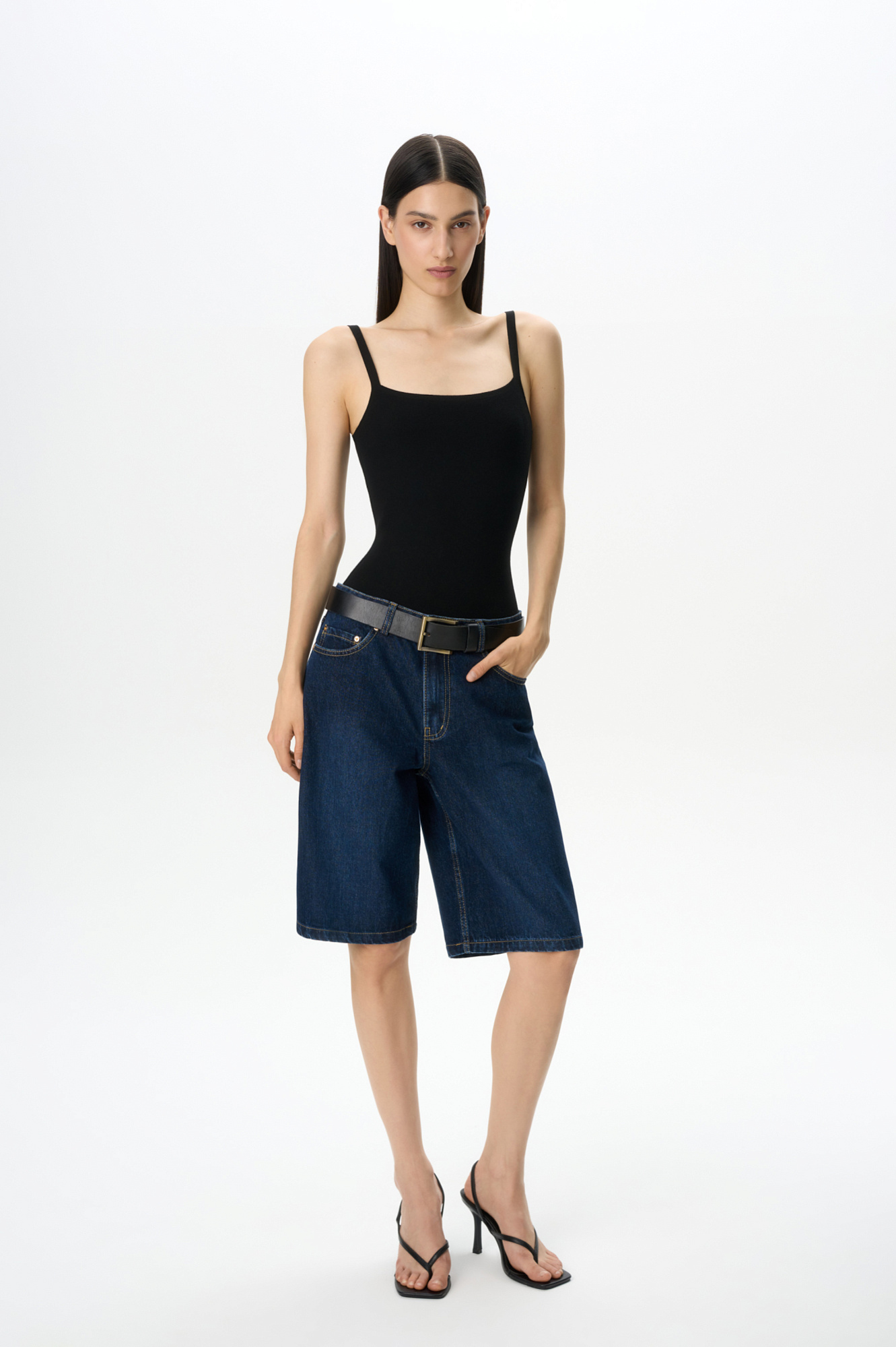 Джинсовые шорты-бермуды из 100% хлопка. Модель прямого кроя, со средней посадкой. Шлевки на поясе для ремня. Пять карманов. Застежка на молнию и металлическую пуговицу.