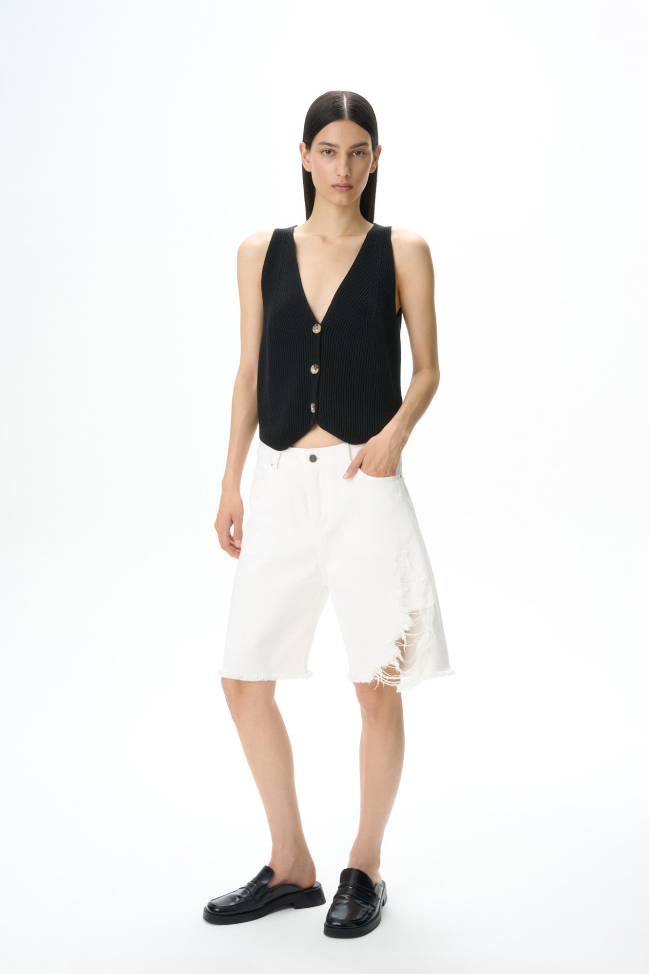 Джинсовые шорты из 100% хлопка. Модель прямого кроя с пятью карманами, со средней посадкой, шлевками на поясе для ремня и застежкой на молнию и металлическую пуговицу. Изделие декорировано имитацией необработанного края и дранью на штанине.