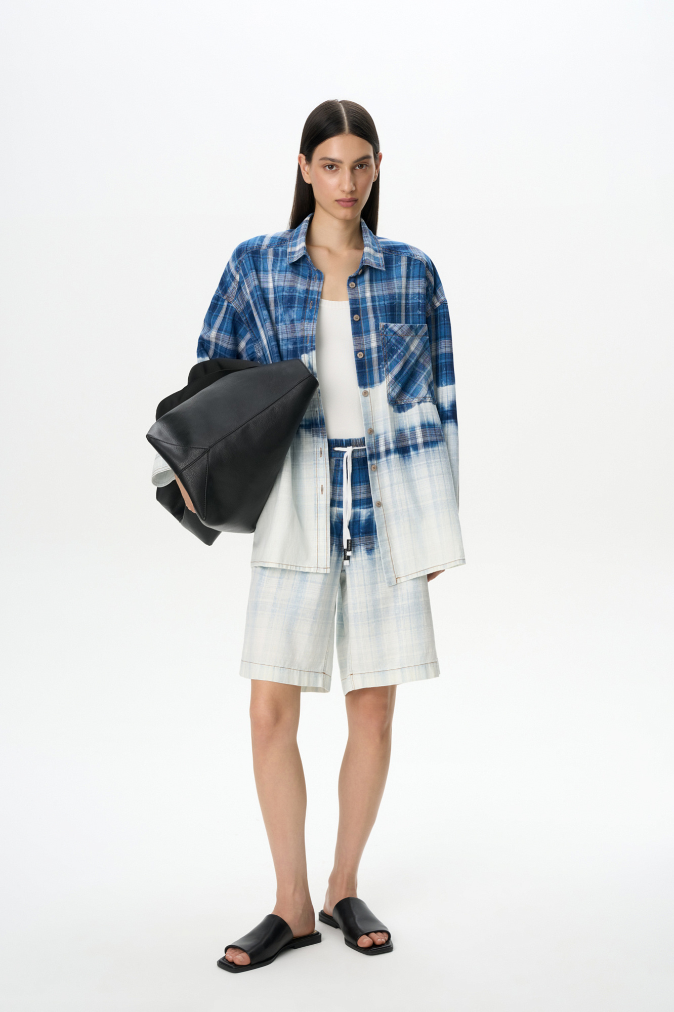 Принтованные шорты в клетку из 100% хлопка с эффектом тай-дай. Модель прямого кроя, со средней посадкой, боковыми карманами и эластичным поясом на кулиске. Дополнить образ можно рубашкой в таком же стиле.