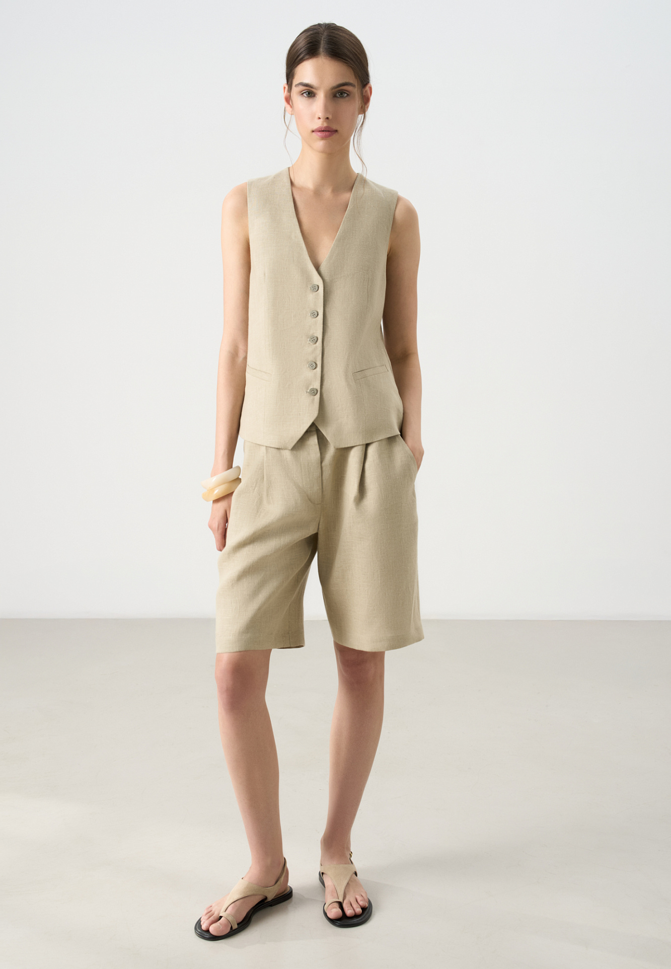 Шорты из 100% льна. Модель с высокой посадкой, широкими штанинами и складками спереди. Два кармана спереди и сзади. Застежка на пуговицу и молнию. Шлевки на поясе для ремня.