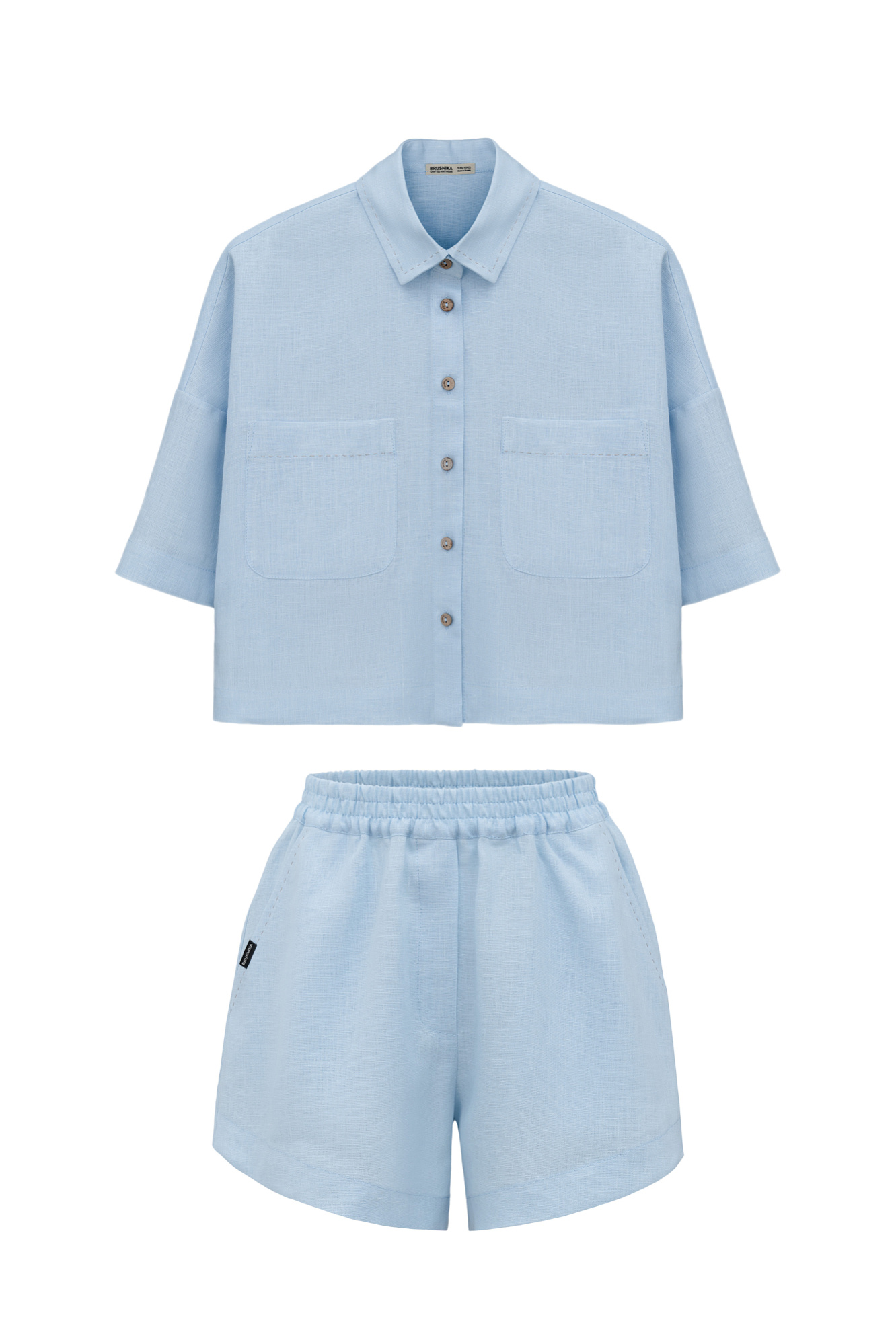 Комплект из 100% льна. Укороченная рубашка с отложным воротником, накладными карманами и спущенной линией плеч. Короткие шорты прямого кроя с боковыми карманами и эластичным поясом на резинке.