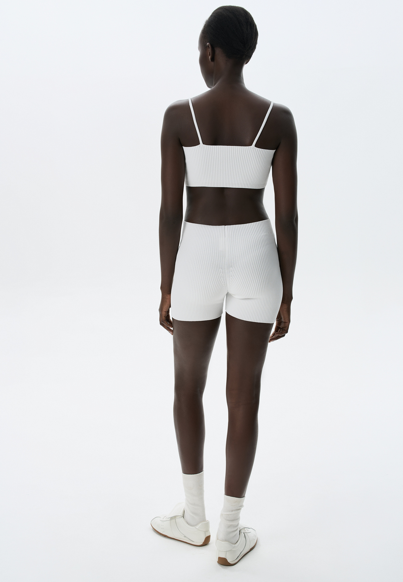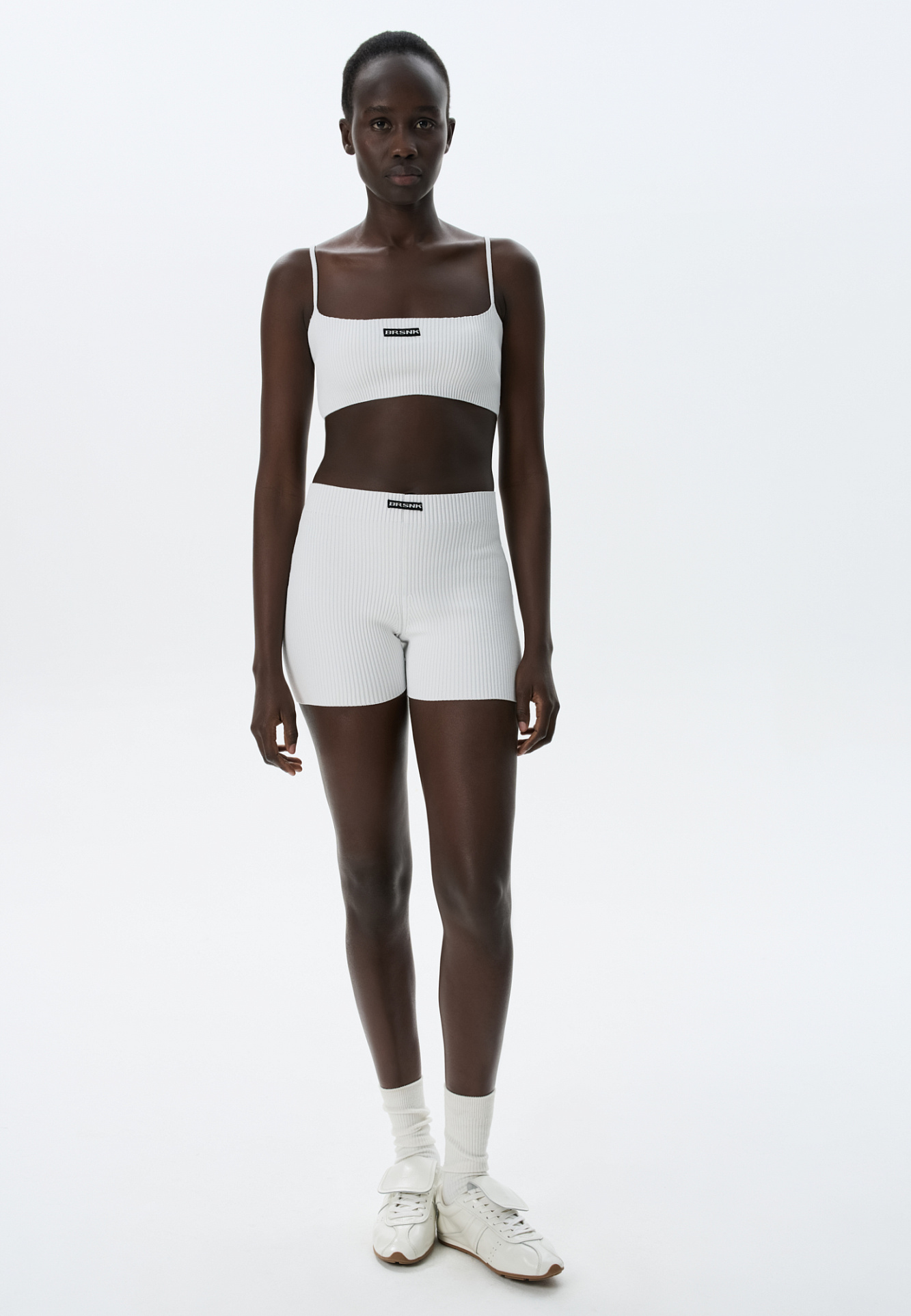 Трикотажные велосипедки из вискозы. Модель с эластичным поясом и жаккардовым ярлыком. Изделие выполнено в рубчик. Дополнить образ можно топом в таком же стиле.