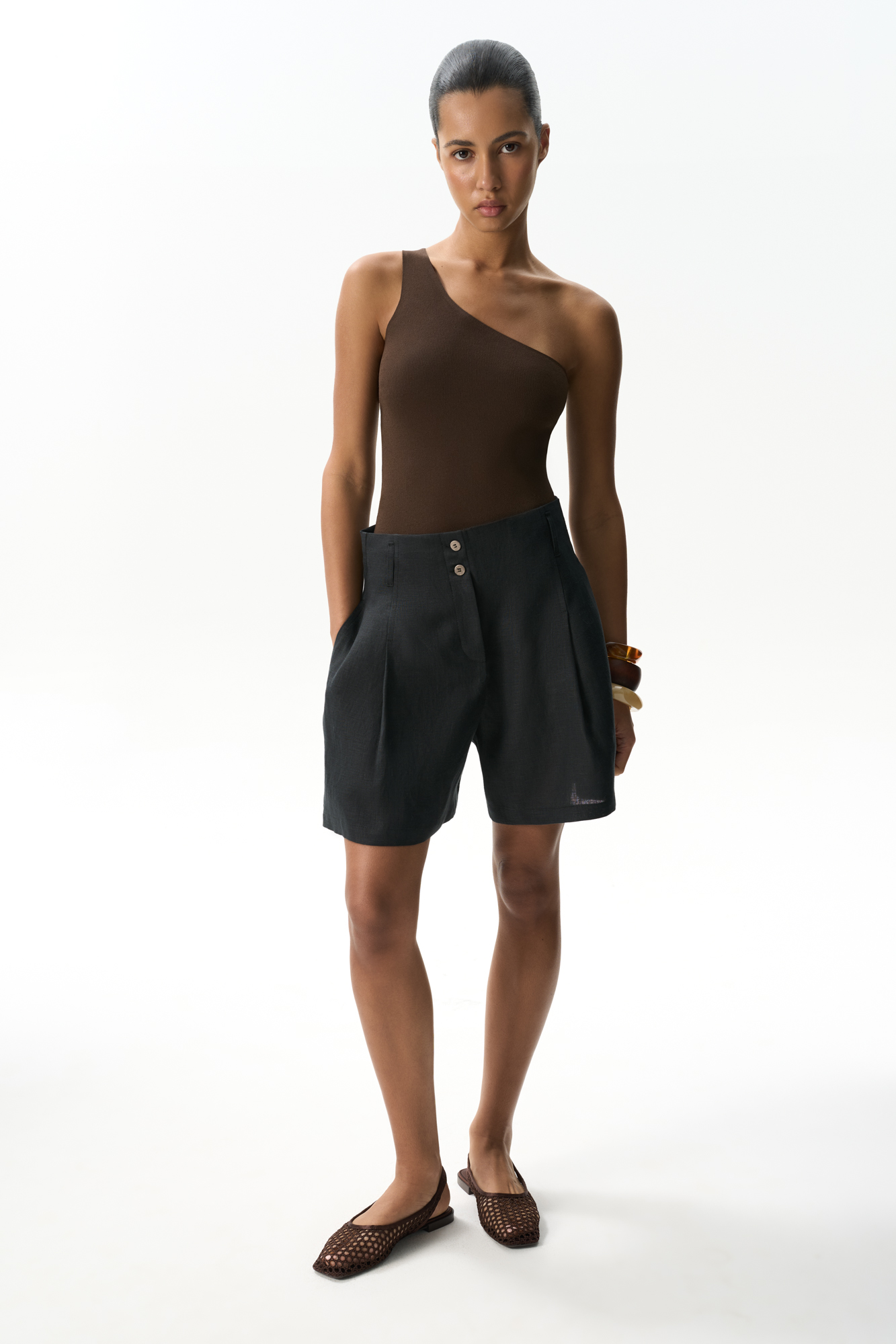 Шорты из 100% льна с высокой посадкой. Модель прямого кроя с защипами и боковыми карманами. Шлевки на поясе для ремня. Застежка на молнию и две пуговицы.