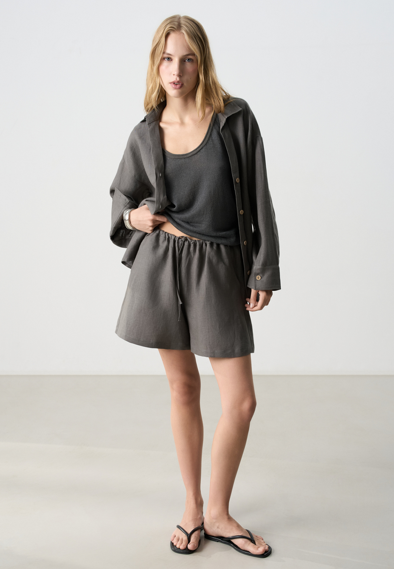 Короткие шорты из 100% льна. Модель прямого кроя с небольшим расширением к низу. Изделие выполнено с поясом на кулиске. Два боковых кармана.