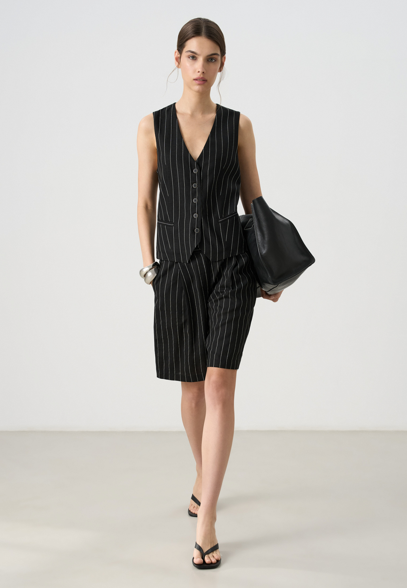 Льняной костюм в полоску из жилета и шорт. Классический жилет прямого кроя, с V-образным вырезом и застежкой на пуговицы. Короткие шорты с боковыми карманами и шлевками на поясе для ремня.Застежка на молнию и пуговицу.