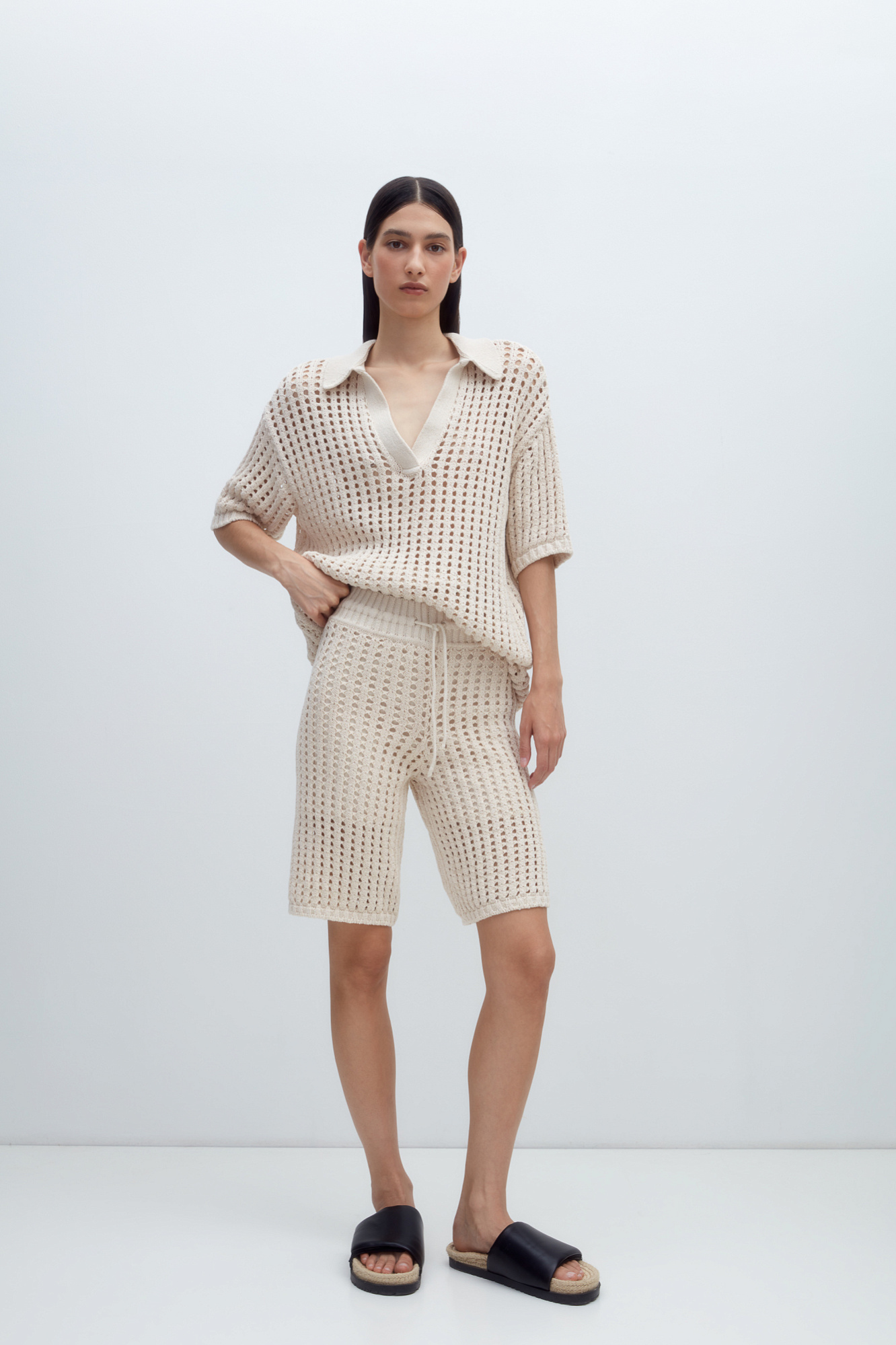 Шорты из 100% хлопка в сетку с поясом из эластичной ленты в рубчик на кулиске. Дополнить ображ можно рубашкой в таком же стиле.