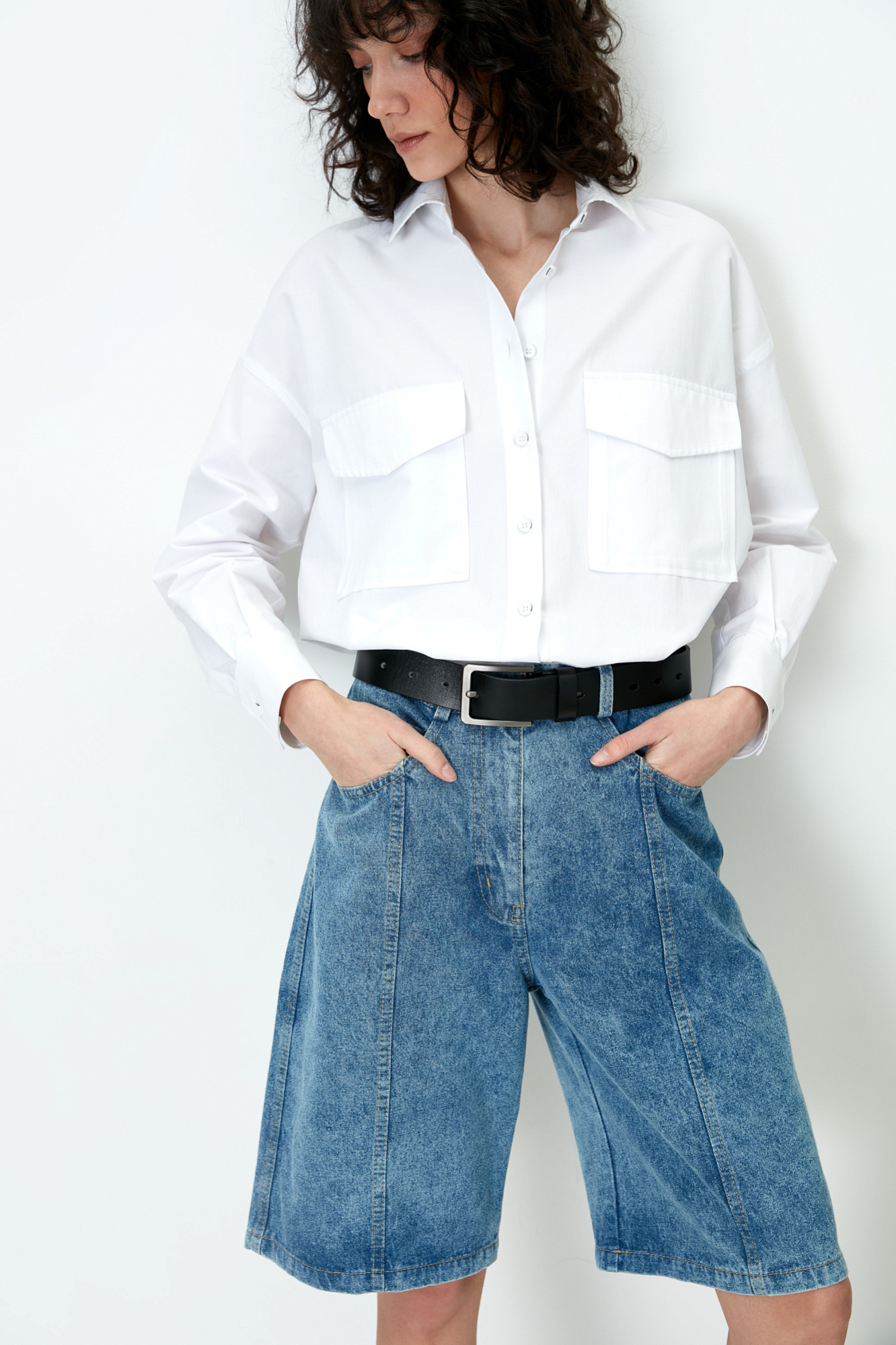 Джинсовые шорты из 100% хлопка. Модель прямого кроя с карманами и потайной застежкой на молнии.