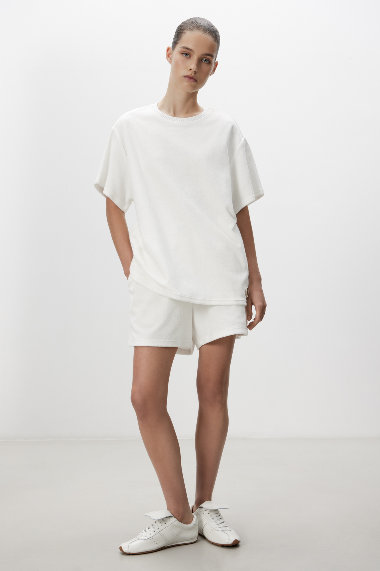 Шорты из махрового трикотажа. Модель свободного силуэта с боковыми карманами и брендированным ярлыком. Эластичный пояс на резинке в рубчик. Дополнить образ можно футболкой в таком же стиле.