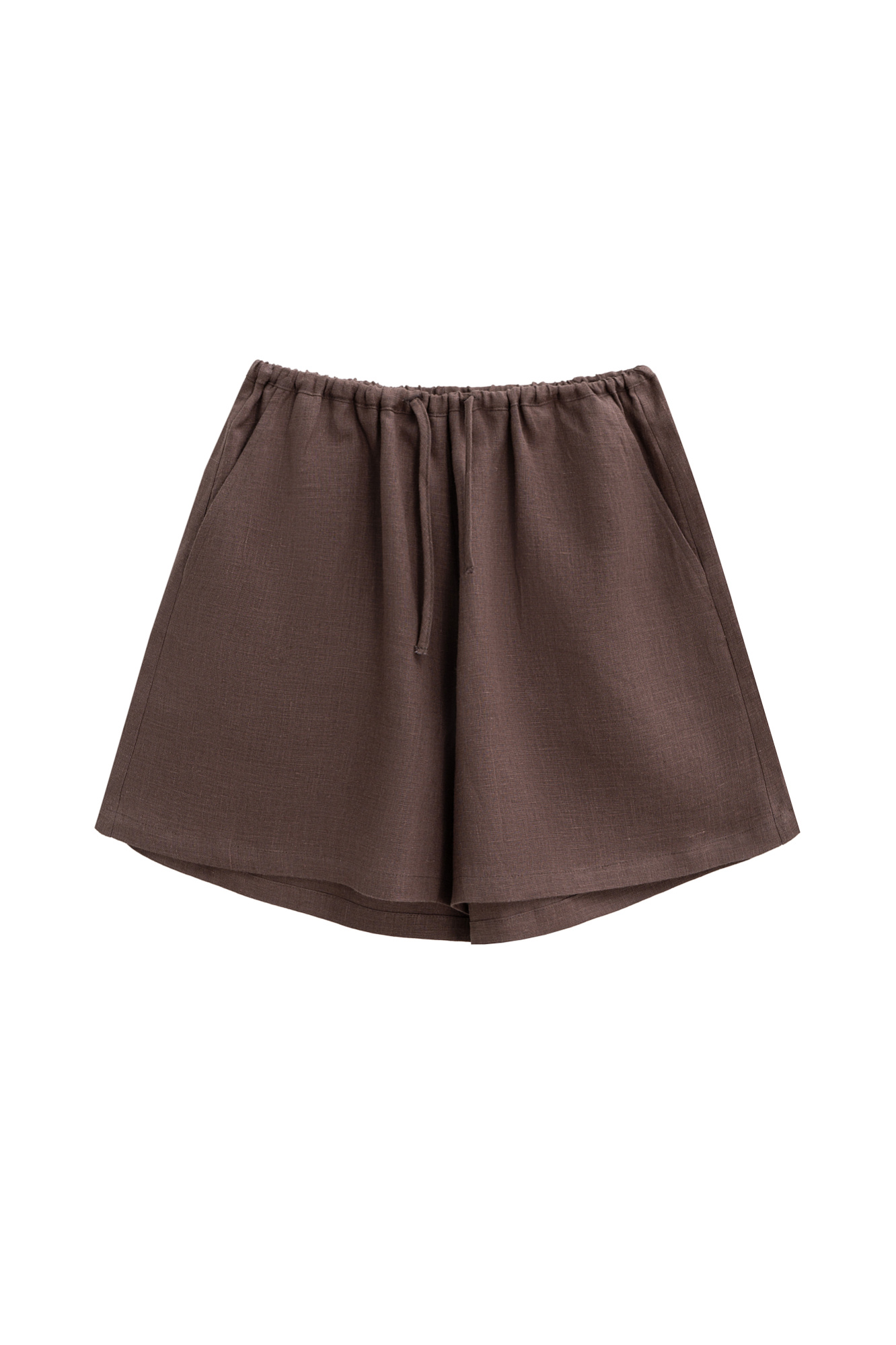 Короткие шорты из 100% льна. Модель прямого кроя с небольшим расширением к низу. Изделие выполнено с поясом на кулиске. Два боковых кармана.