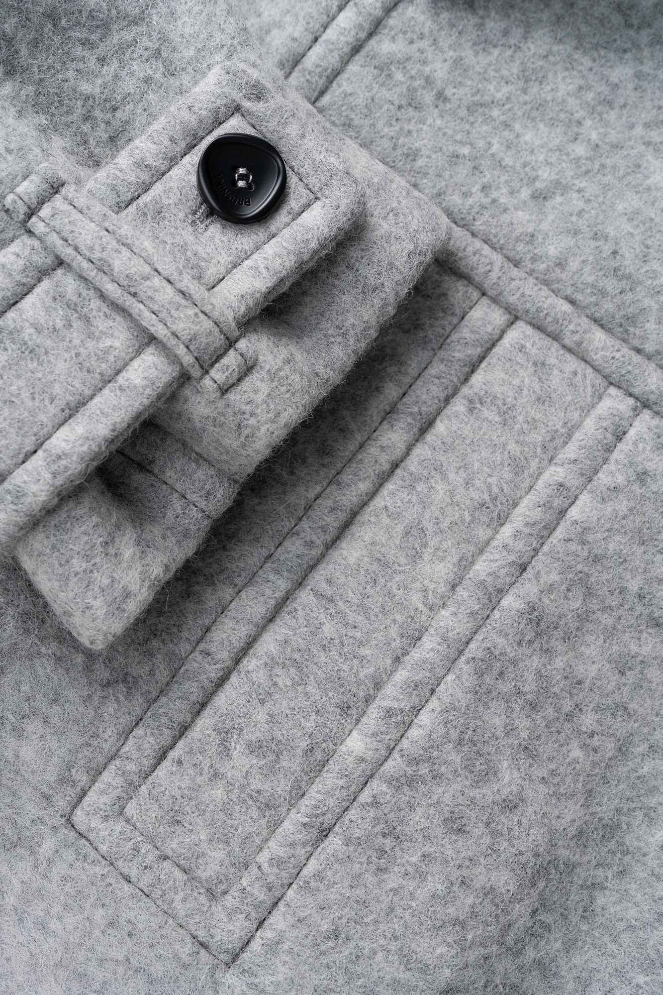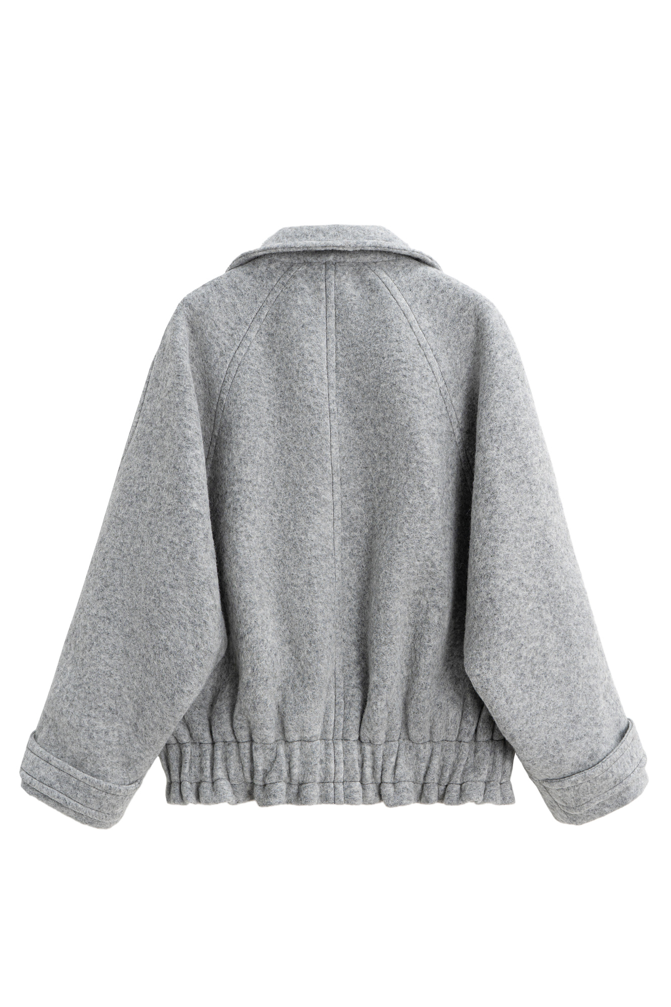 Шерстяной бомбер с воротником-стойкой. Модель свободного силуэта, с патами на пуговицах на манжетах и по низу изделия, застежка на молнию и магнитные пуговицы под планкой, декорированной экокожей. Бомбер выполнен на подкладке.