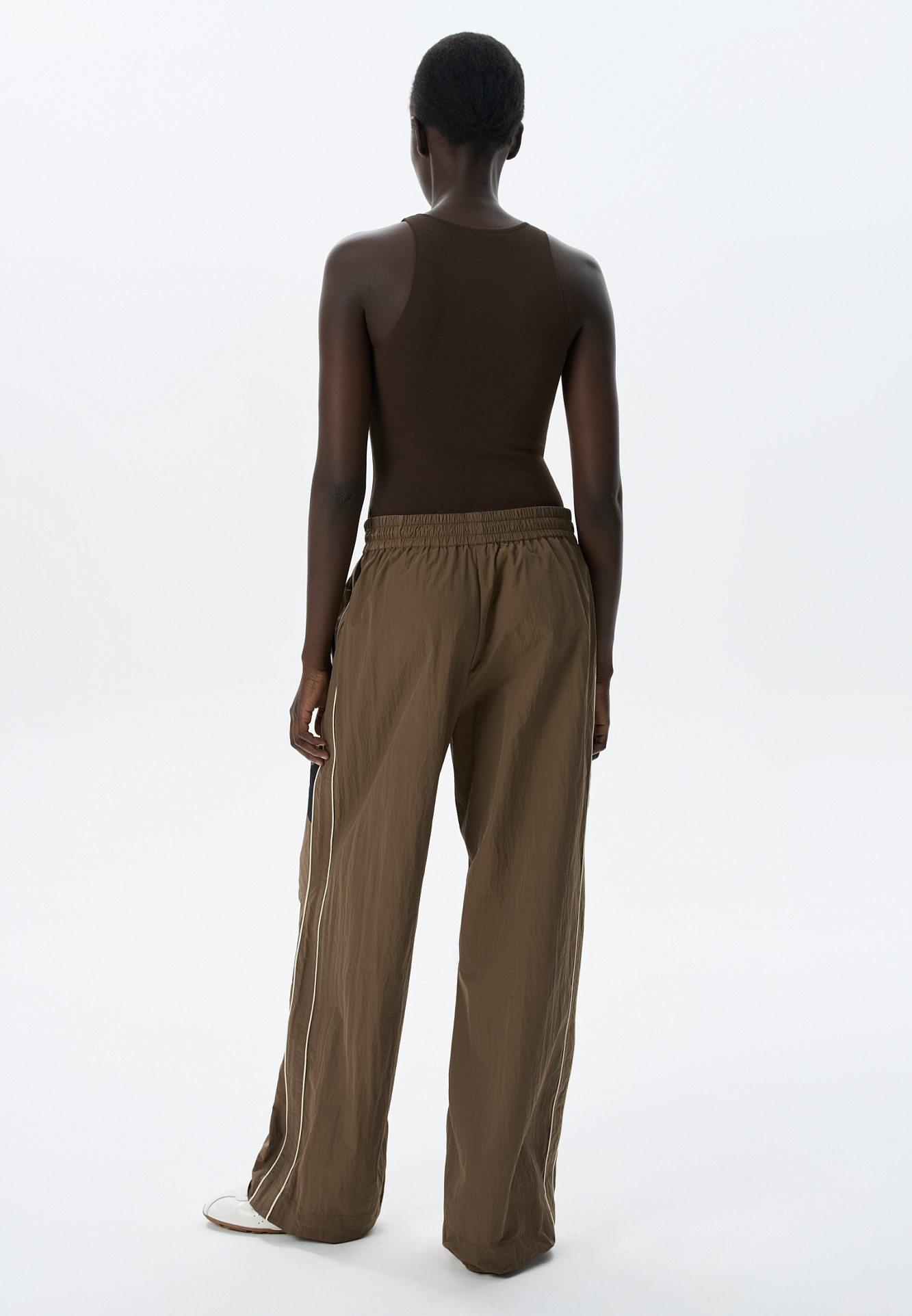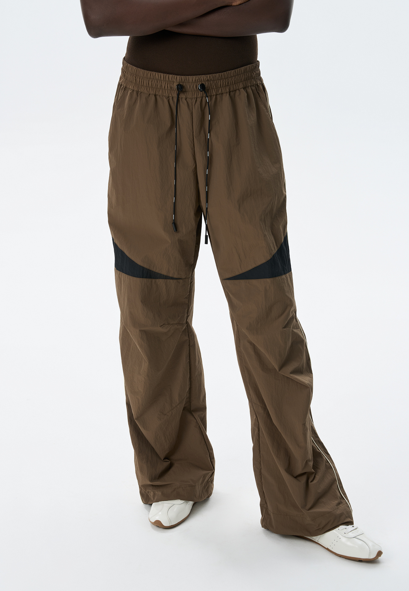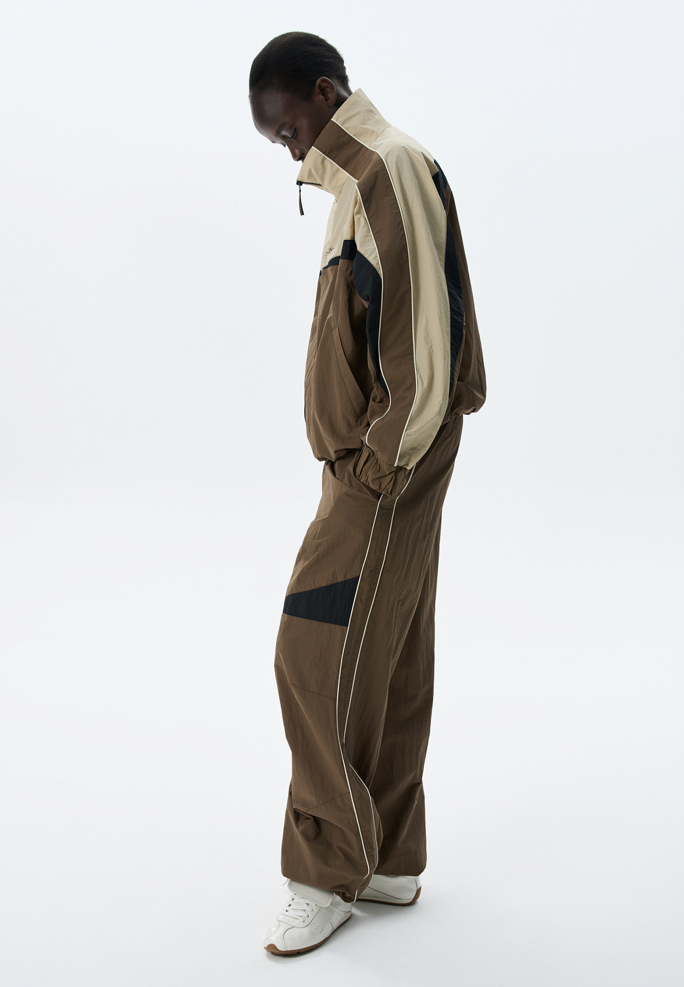 Спортивные брюки из 100% нейлона. Модель свободного силуэта, с широким эластичным поясом на резинке, дополненным кулиской. Изделие декорировано контрастными вставками. Дополнить образ можно олимпийкой в таком же стиле.