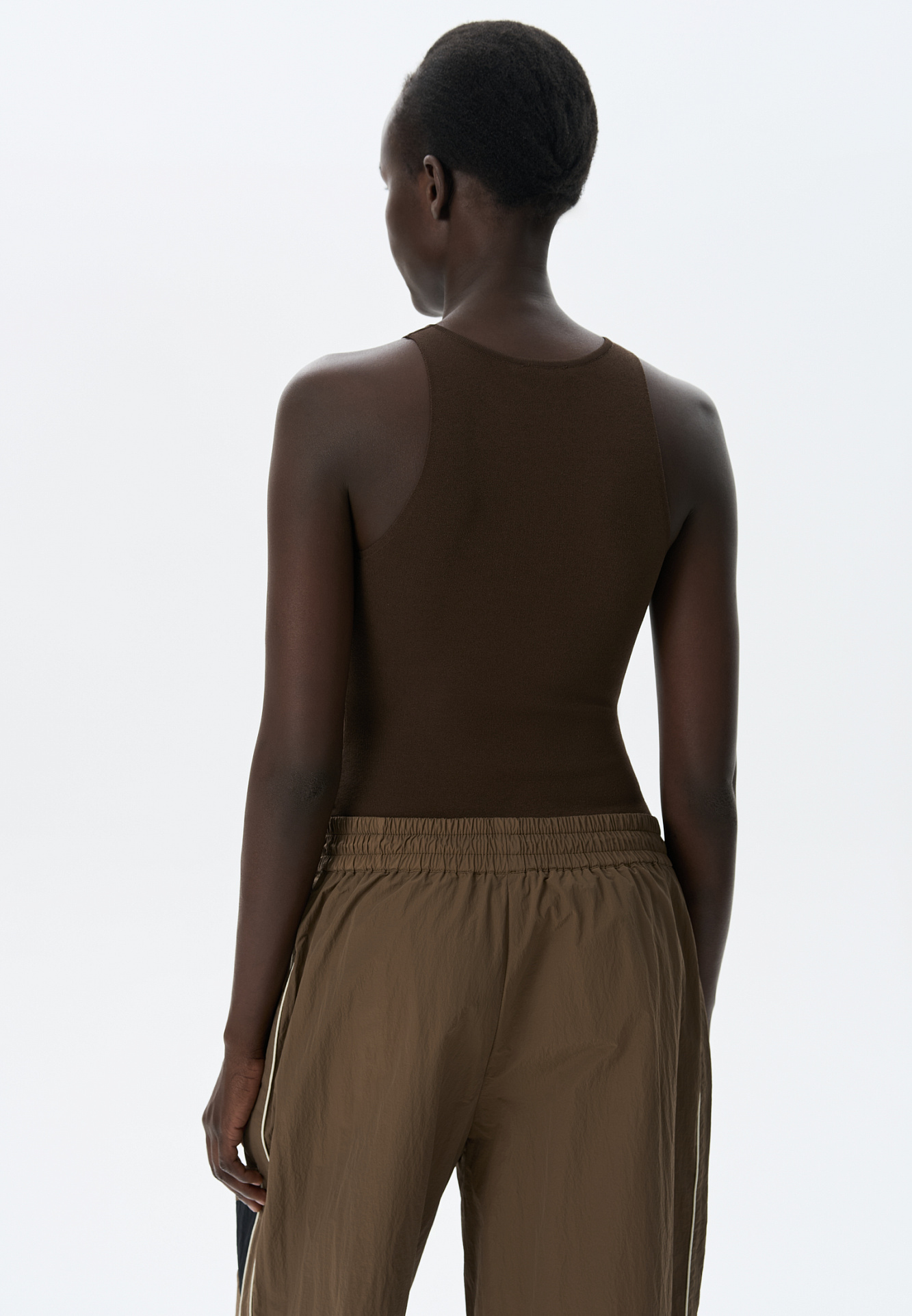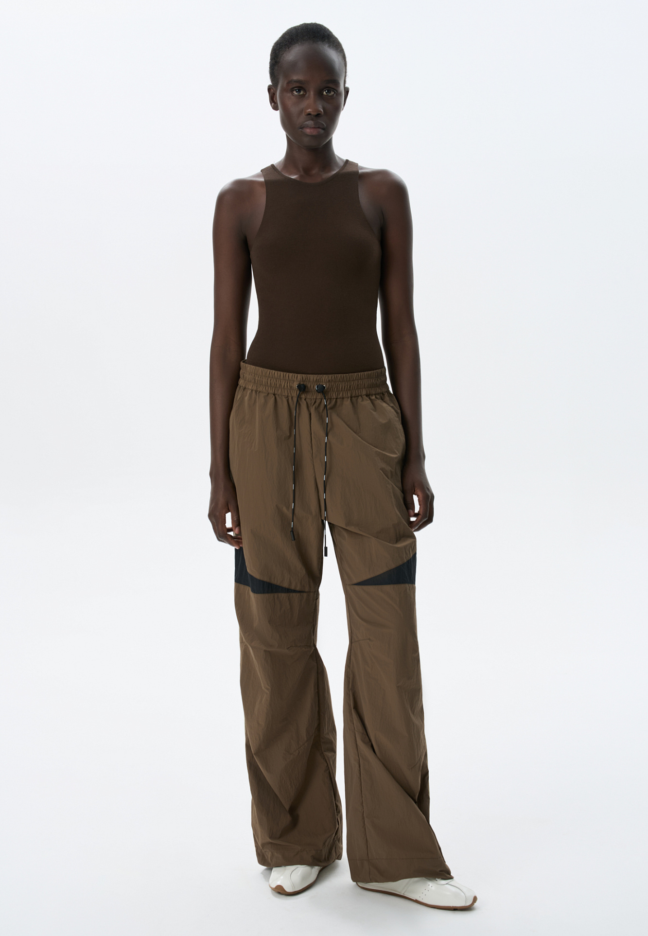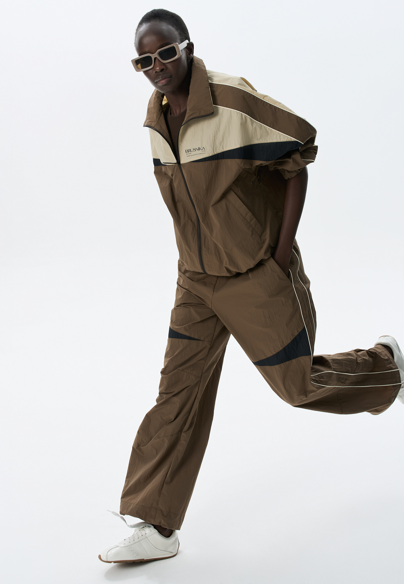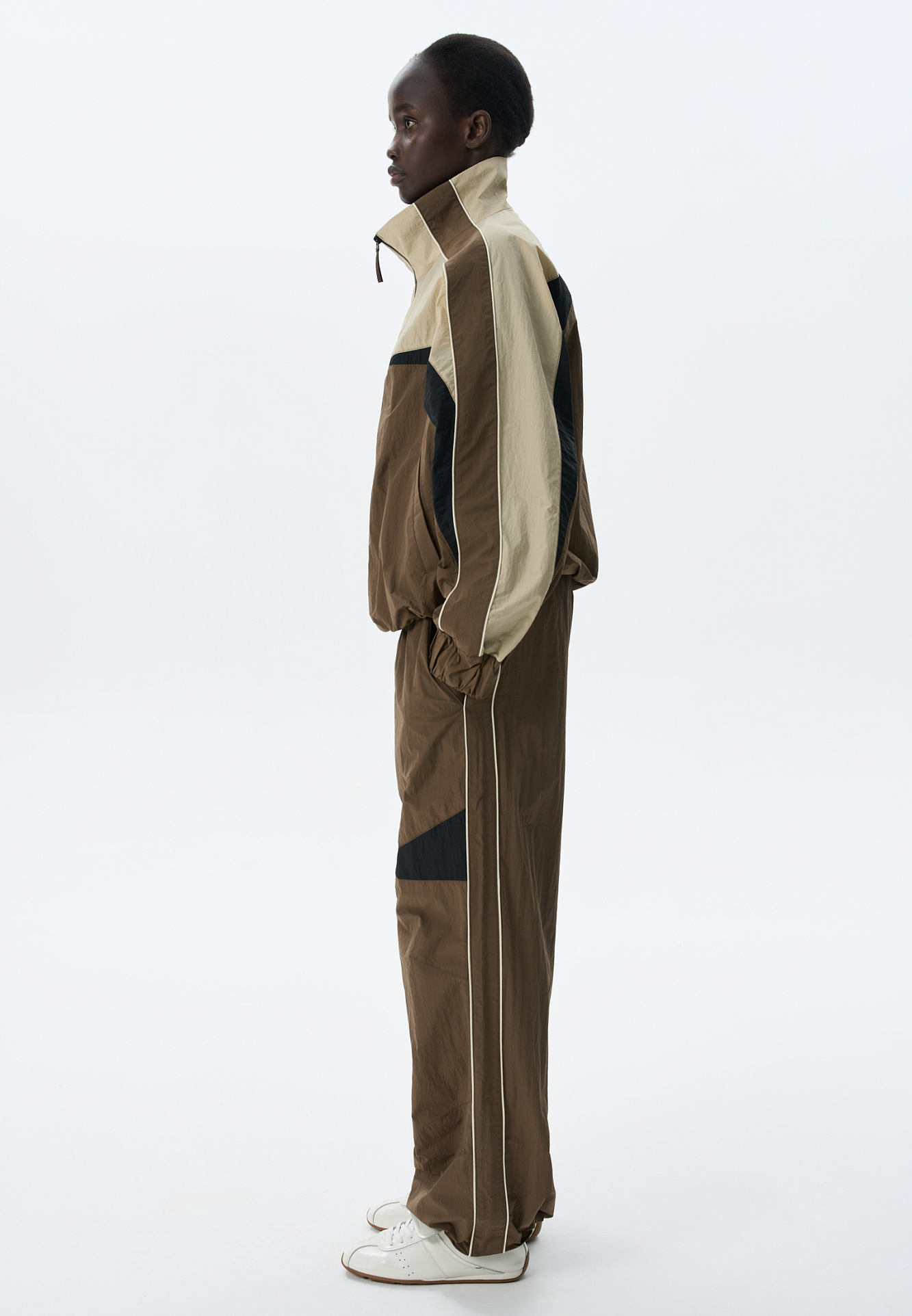 Спортивные брюки из 100% нейлона. Модель свободного силуэта, с широким эластичным поясом на резинке, дополненным кулиской. Изделие декорировано контрастными вставками. Дополнить образ можно олимпийкой в таком же стиле.