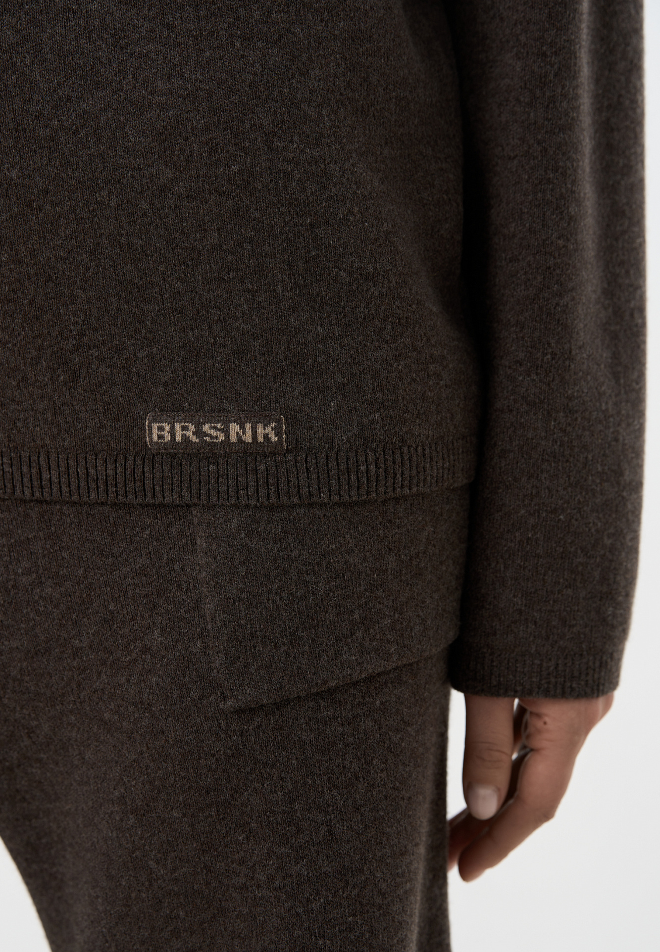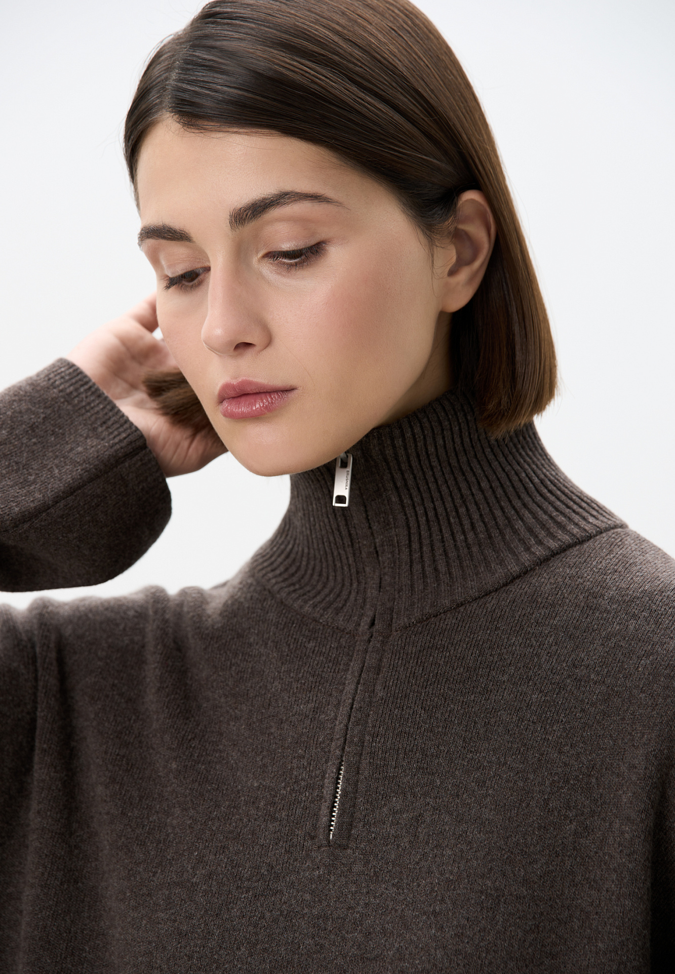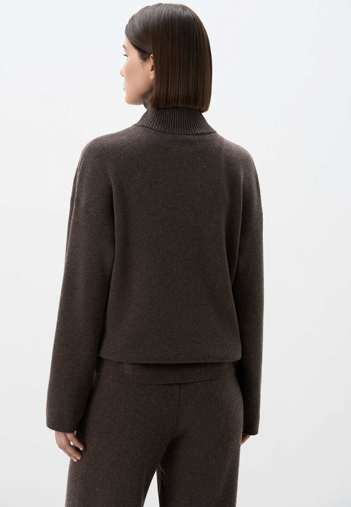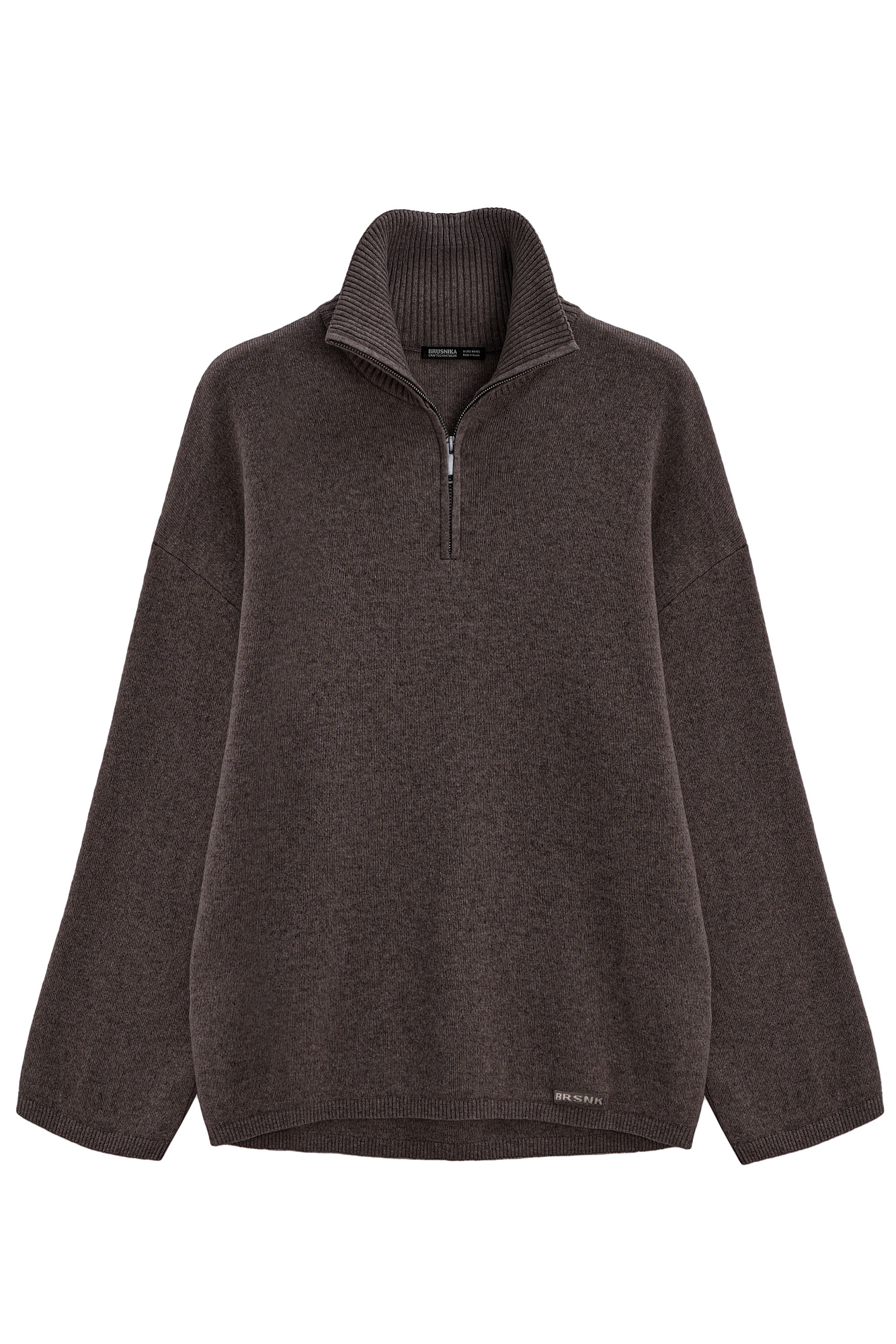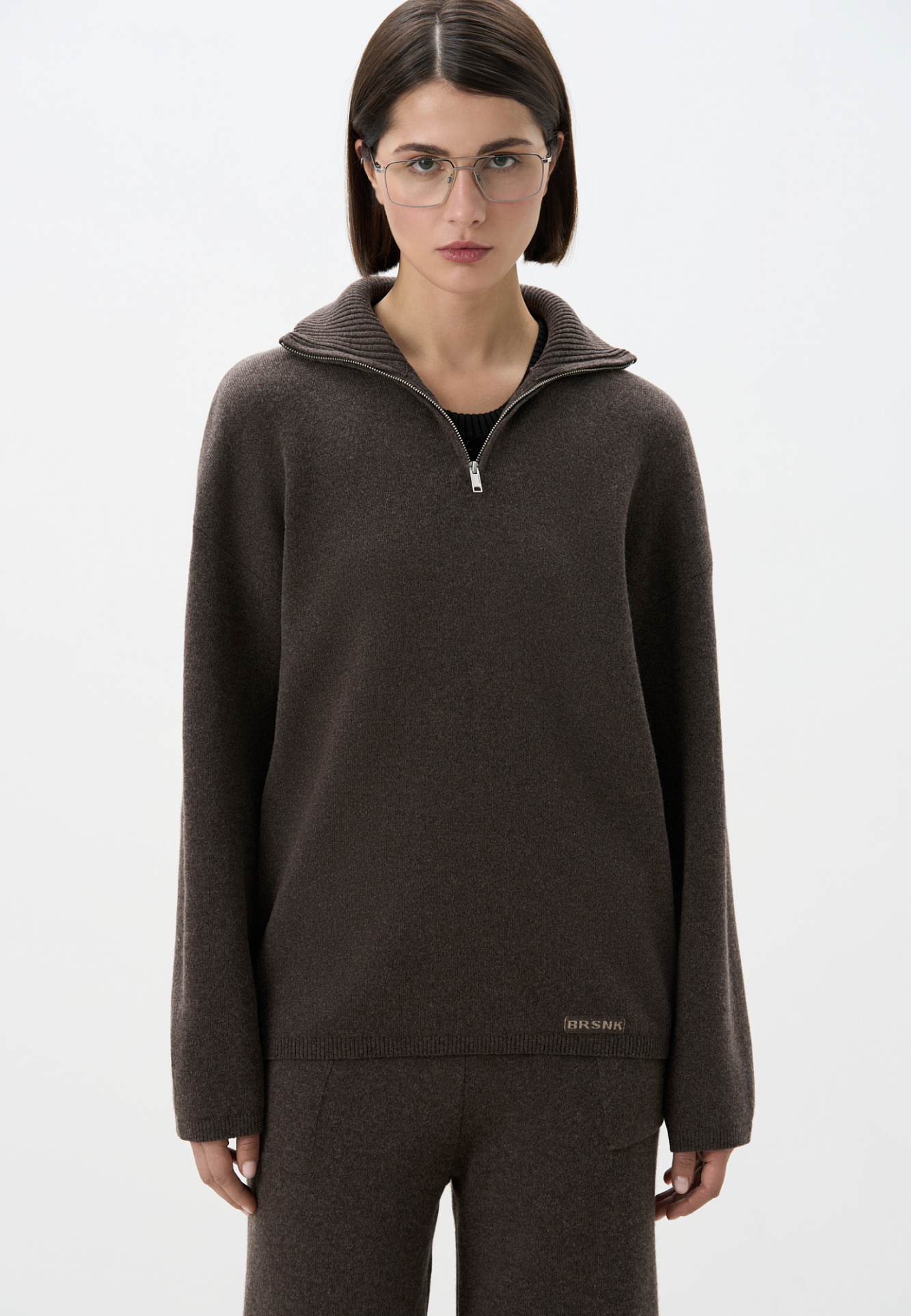 Трикотажный джемпер из кашемира и шерсти. Модель свободного кроя, с высоким воротом на молнии и спущенной линией плеч. Ворот и края изделия выполнены в рубчик.