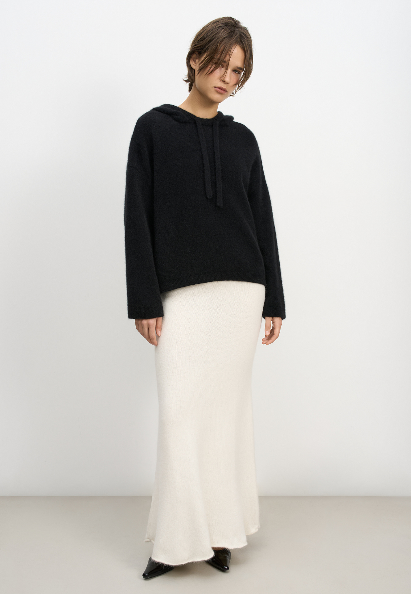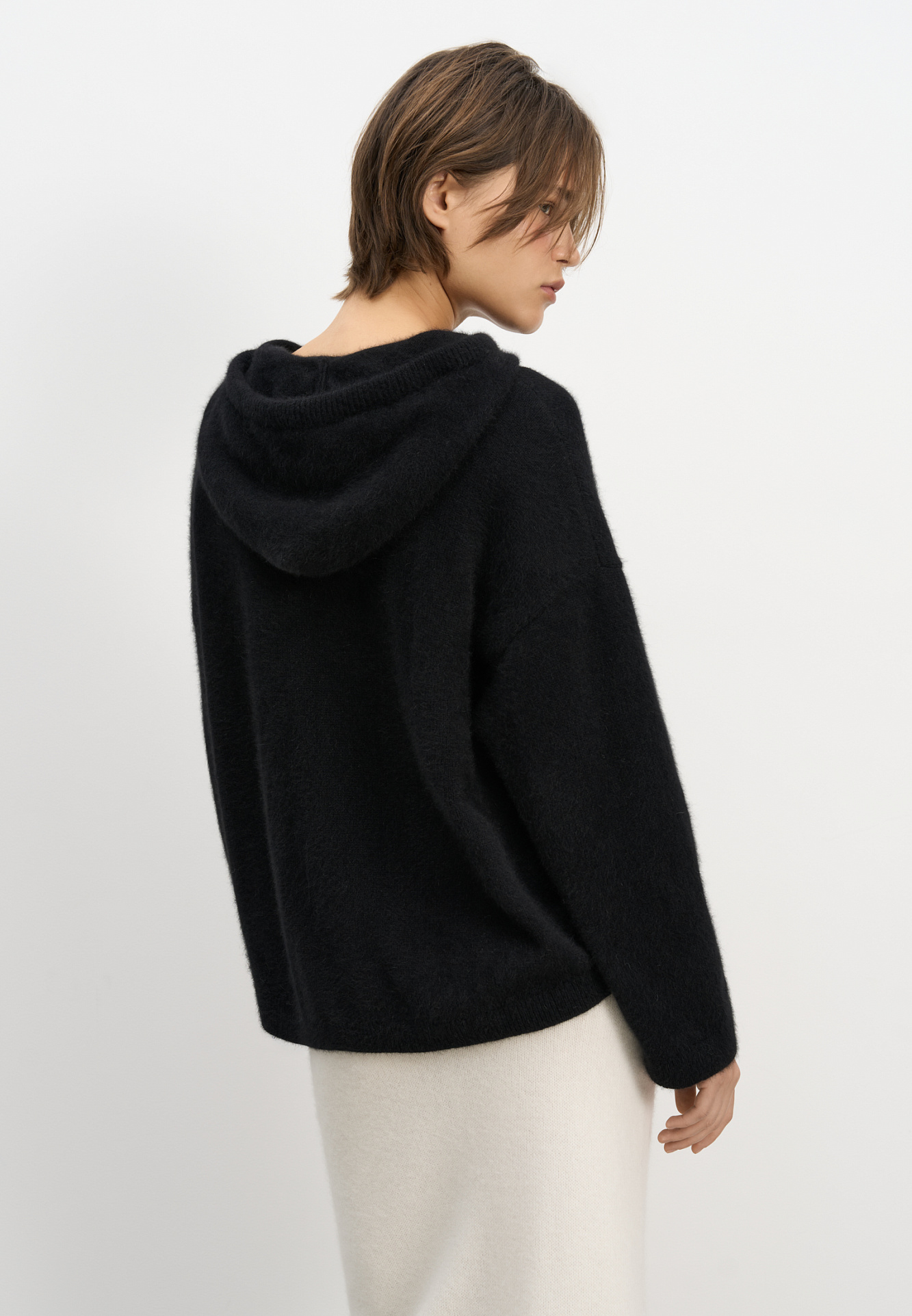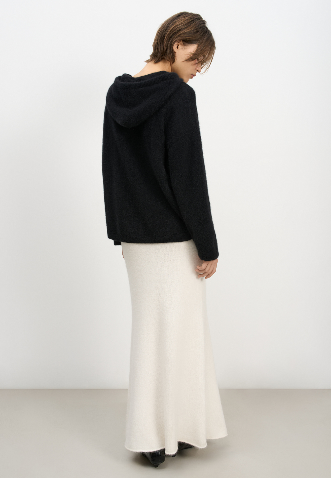 Трикотажное худи из пуха лисы. Модель свободного силуэта с капюшоном и спущенной линией плеча.