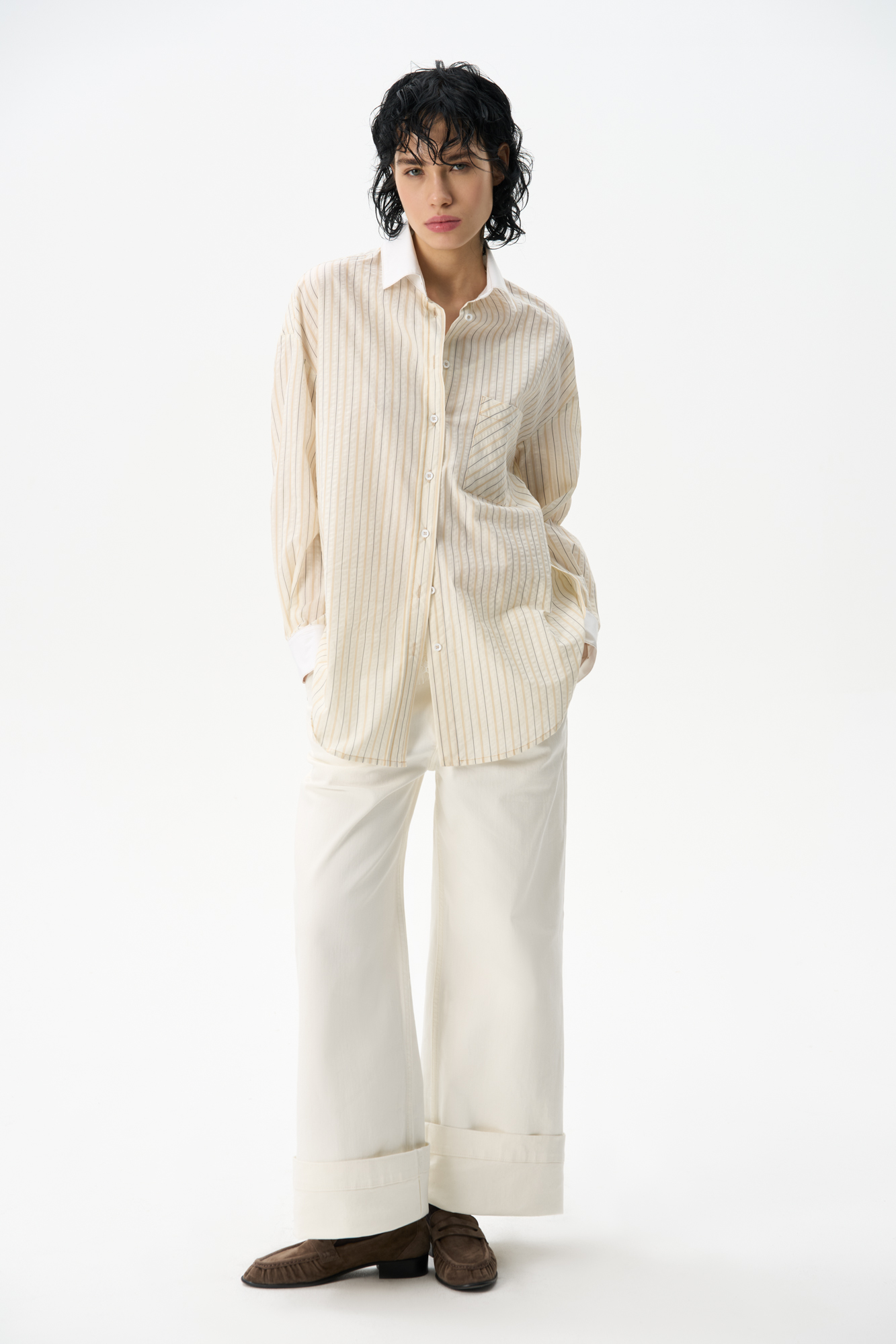 Джинсы, выполненные из 100% хлопка. Модель прямого свободного кроя с боковыми и задними карманами, шлевками на поясе для ремня, вставкой из эластичной резинки по спинке и застежкой на молнию и две металлические пуговицы.