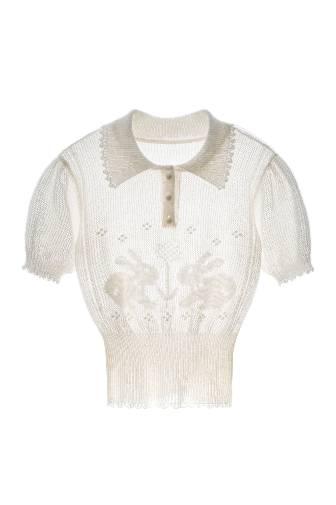 Трикотажная футболка из супер кид мохера и шерсти беби альпака. Изделие выполнено ажурным переплетением с дизайном в виде кроликов. Модель с воротником поло, планкой на пуговицах и коротким рукавом-фонариком.