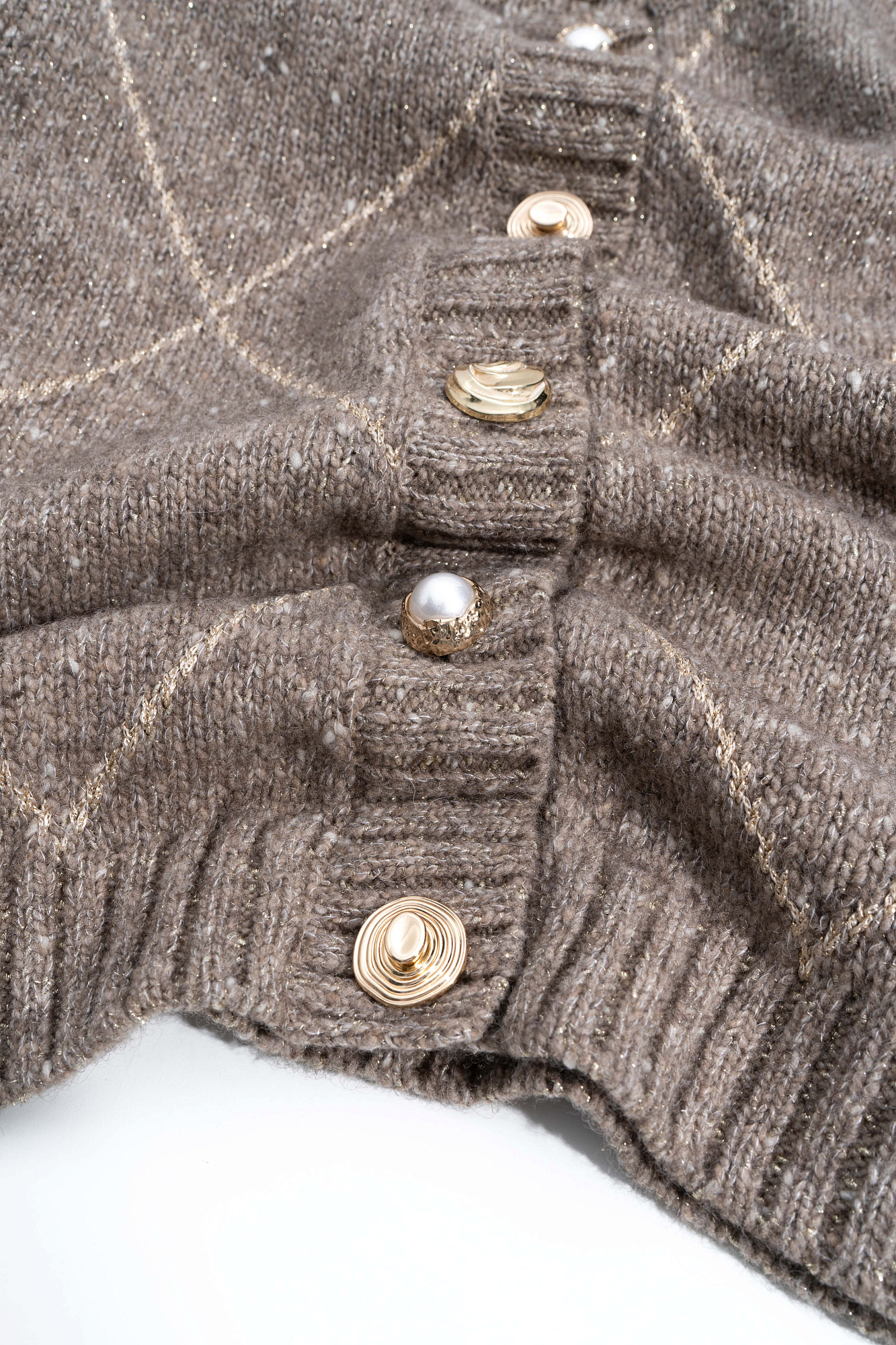 Трикотажный кардиган с узором аргайл из шерсти яка с добавлением люрекса. Модель свободного силуэта со спущенной линией плеч, круглым вырезом горловины и застежкой на крупные пуговицы. Края изделия выполнены в рубчик.