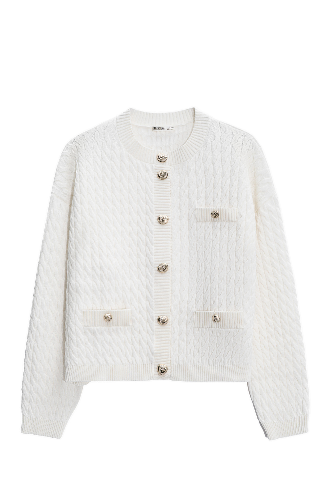 Кардиган из 100% шерсти мериноса экстрафайн, выполненный вязкой косами. Модель свободного кроя с длинными рукавами, спущенной линией плеч и круглым вырезом горловины. Имитация карманов с клапанами. Изделие декорировано крупными акцентными пуговицами.