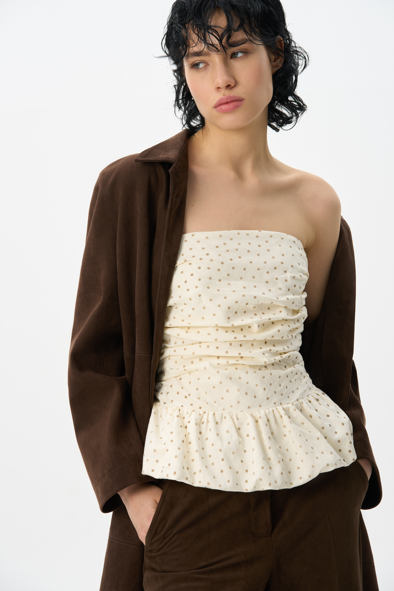 Корсет в горошек с баской и драпировкой. Модель приталенного силуэта, без бретелей. Застежка на потайную молнию.