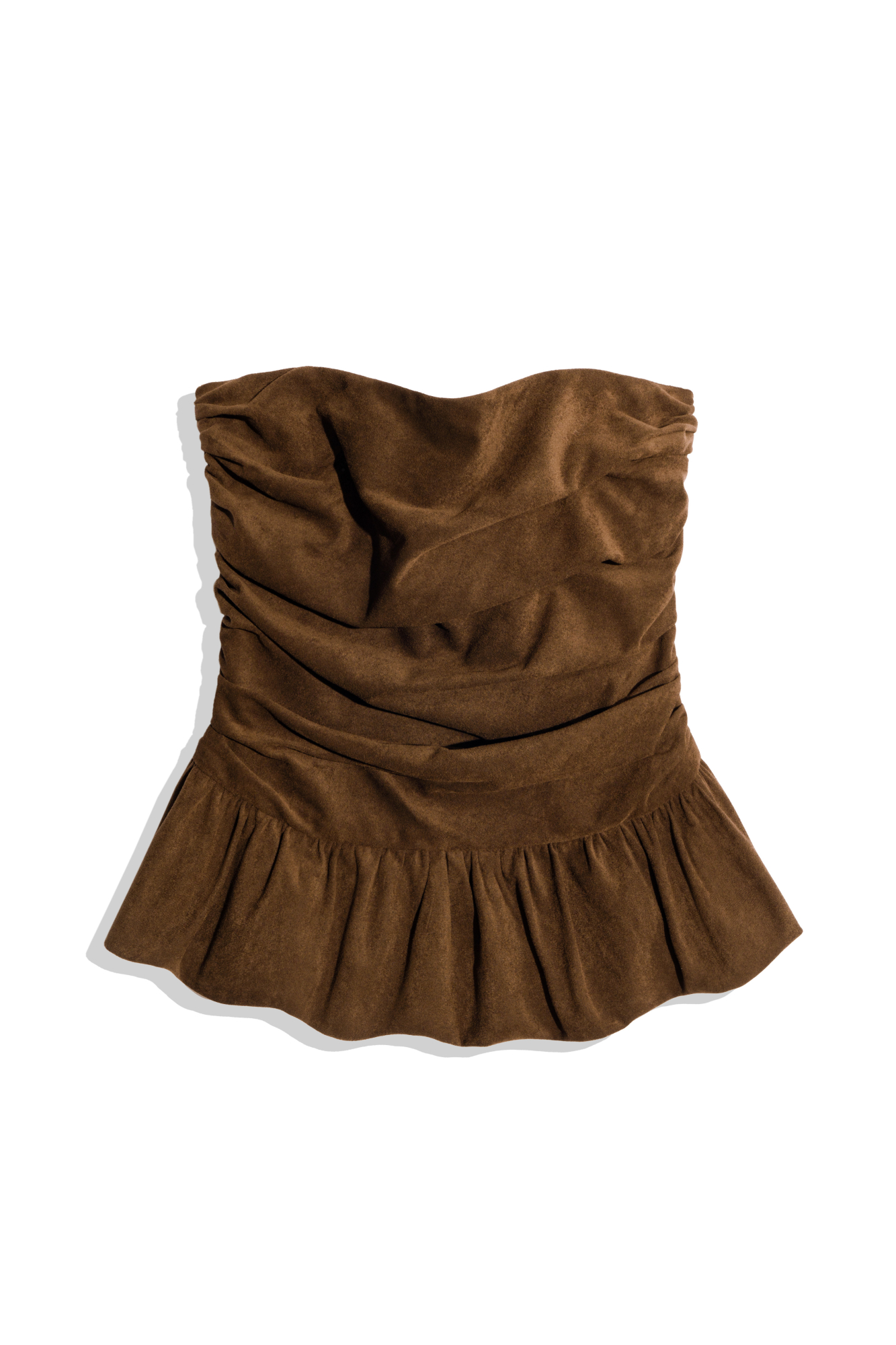 Корсет из ткани с имитацией внешнего вида и свойств натуральной замши. Модель приталенного силуэта, без бретелей, с баской и драпировкой. Застежка на молнию на спинке. Изделие на подкладке.