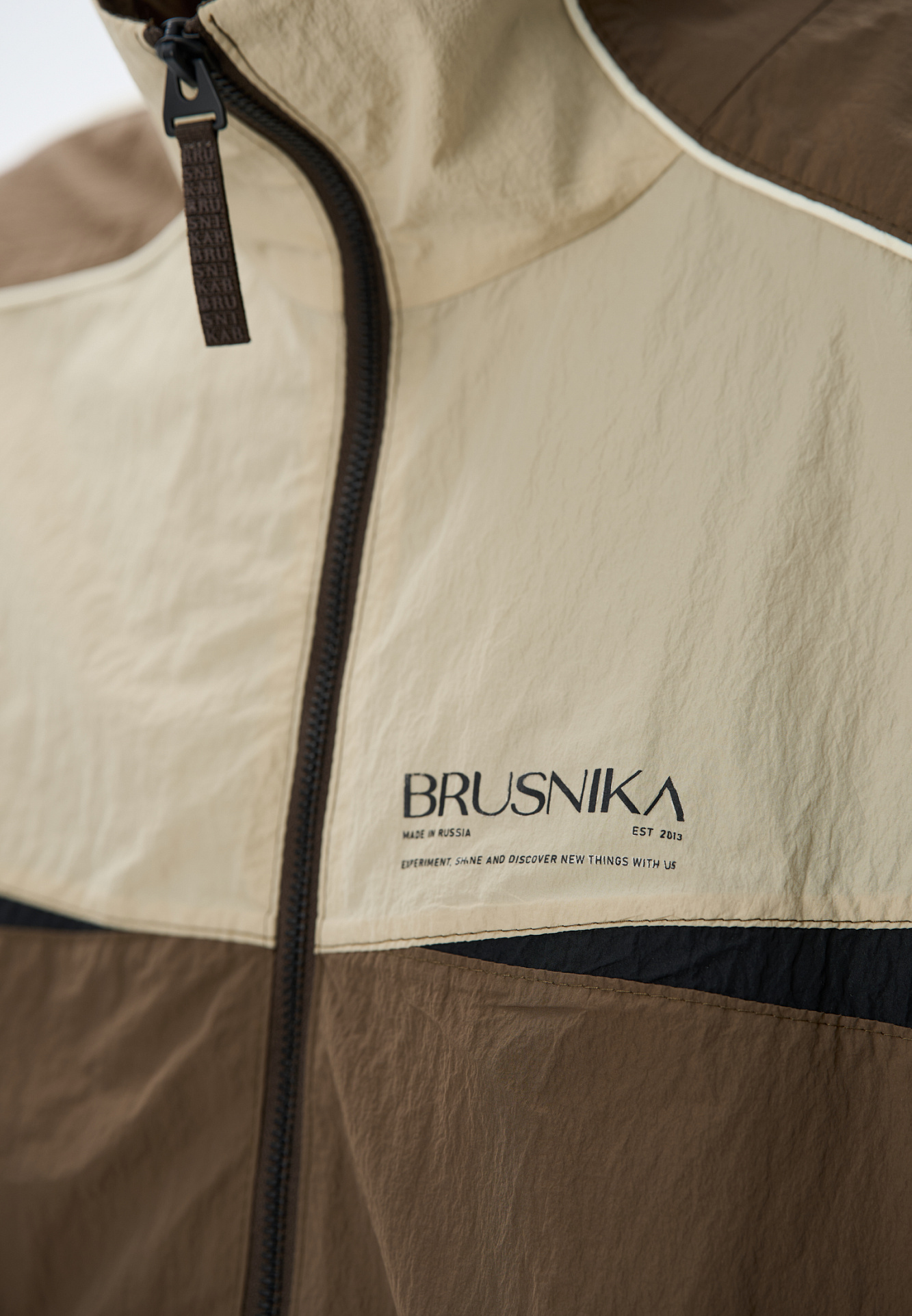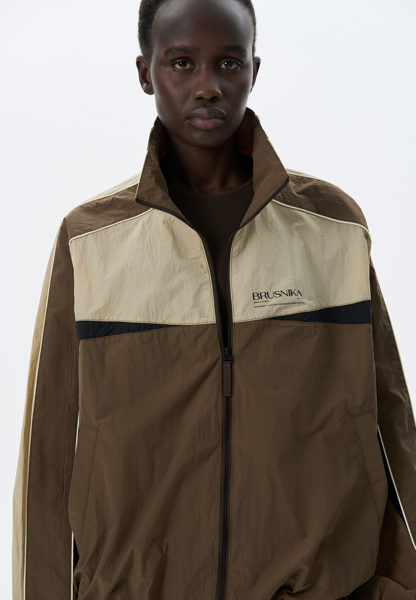 Олимпийка-колорблок из нейлона. Модель свободного кроя, с воротником-стойкой и боковыми карманами. Манжеты рукавов и низ изделия выполнен на резинке. Застежка на молнию. Логотип бренда на спине и груди. Дополнить образ можно брюками в таком же стиле.