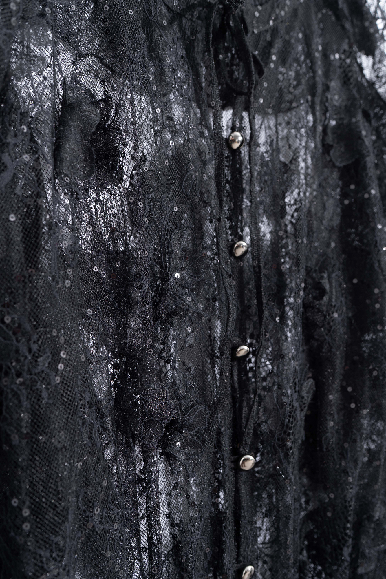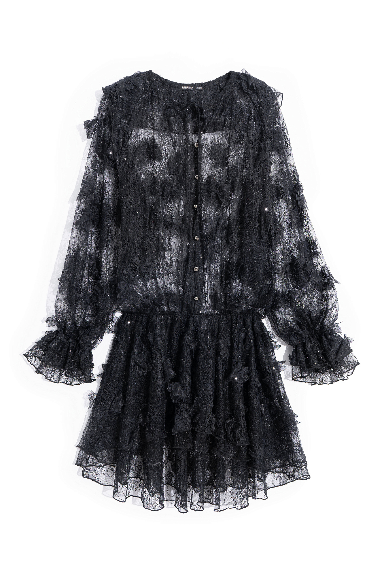 Платье длины мини из тонкого кружева с объемным декором в виде цветов. Модель свободного кроя с длинными рукавами, манжетами, и круглым вырезом горловины с жабо. Застежка на пуговицы. Горловина фиксируется на шее тонким шнурком. Изделие выполнено без подкладки.
