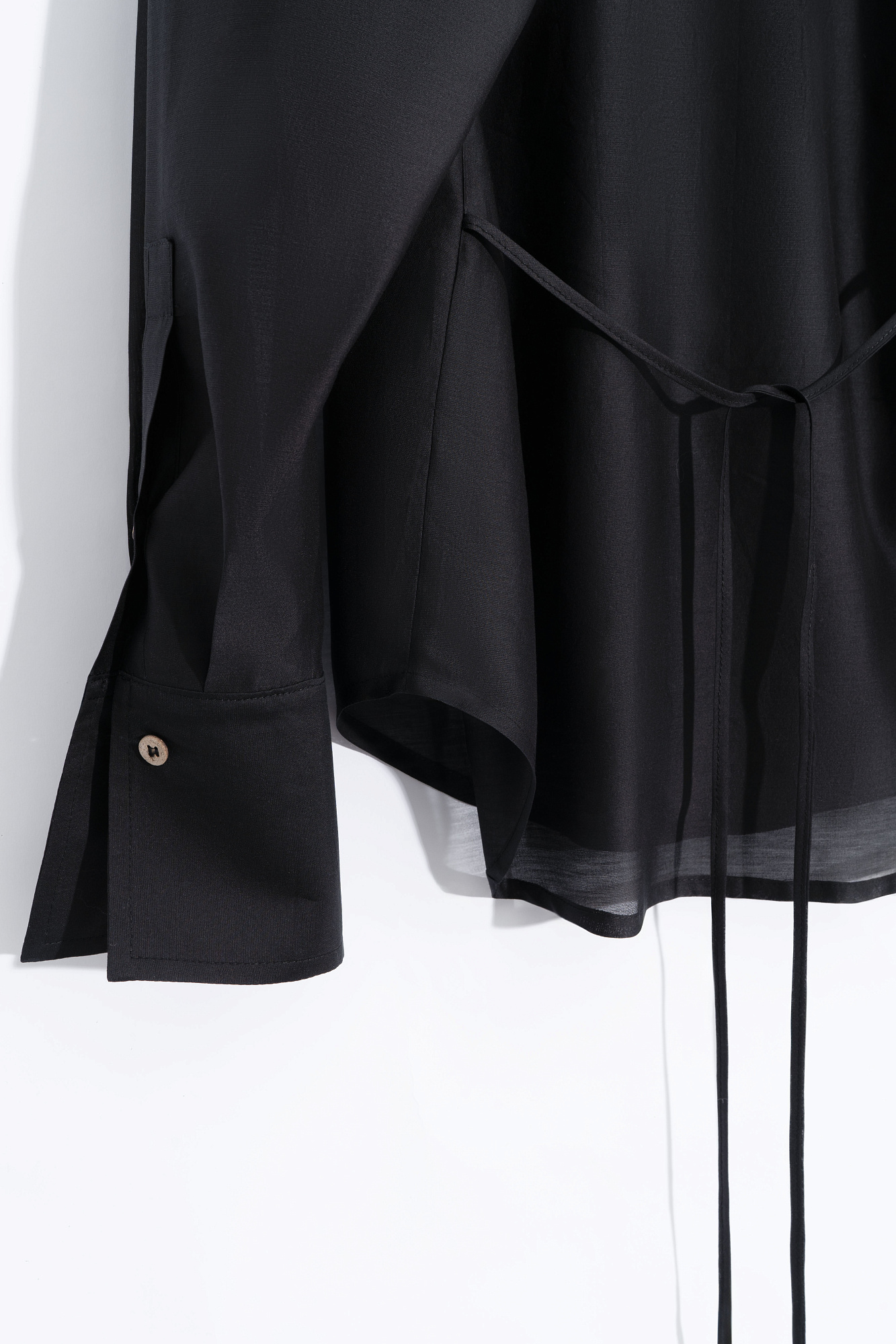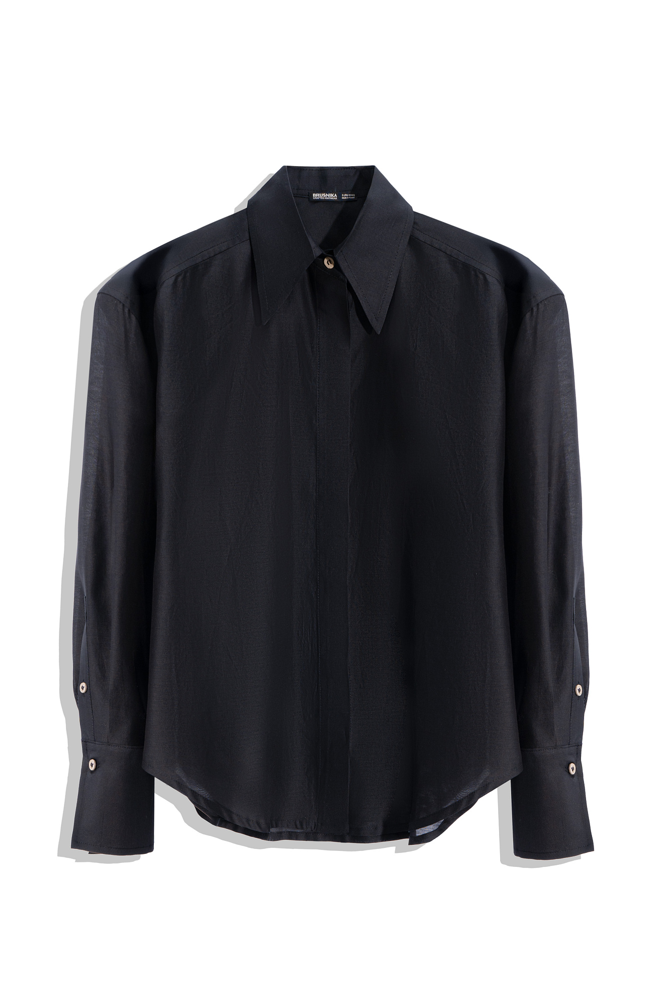 Рубашка из шелка с добавлением хлопка. Модель прямого кроя с длинными рукавами с манжетами, классическим отложным воротником, увеличенными плечами и завязкой на спинке. Застежка на пуговицы под планкой.