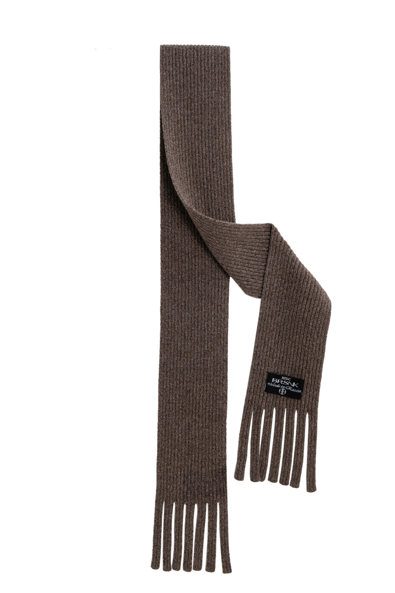 Трикотажный шарф в рубчик. Модель с бахромой и брендированным ярлыком.