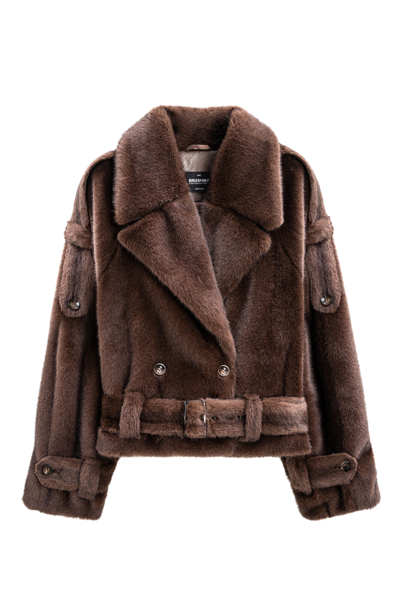 Короткая двубортная шуба из экомеха. Модель прямого кроя с широким отложным воротником. Изделие декорировано эполетами на плечах, широким поясом с пряжкой на талии и манжетах рукавов. Застежка на пуговицы. Изделие на подкладке.