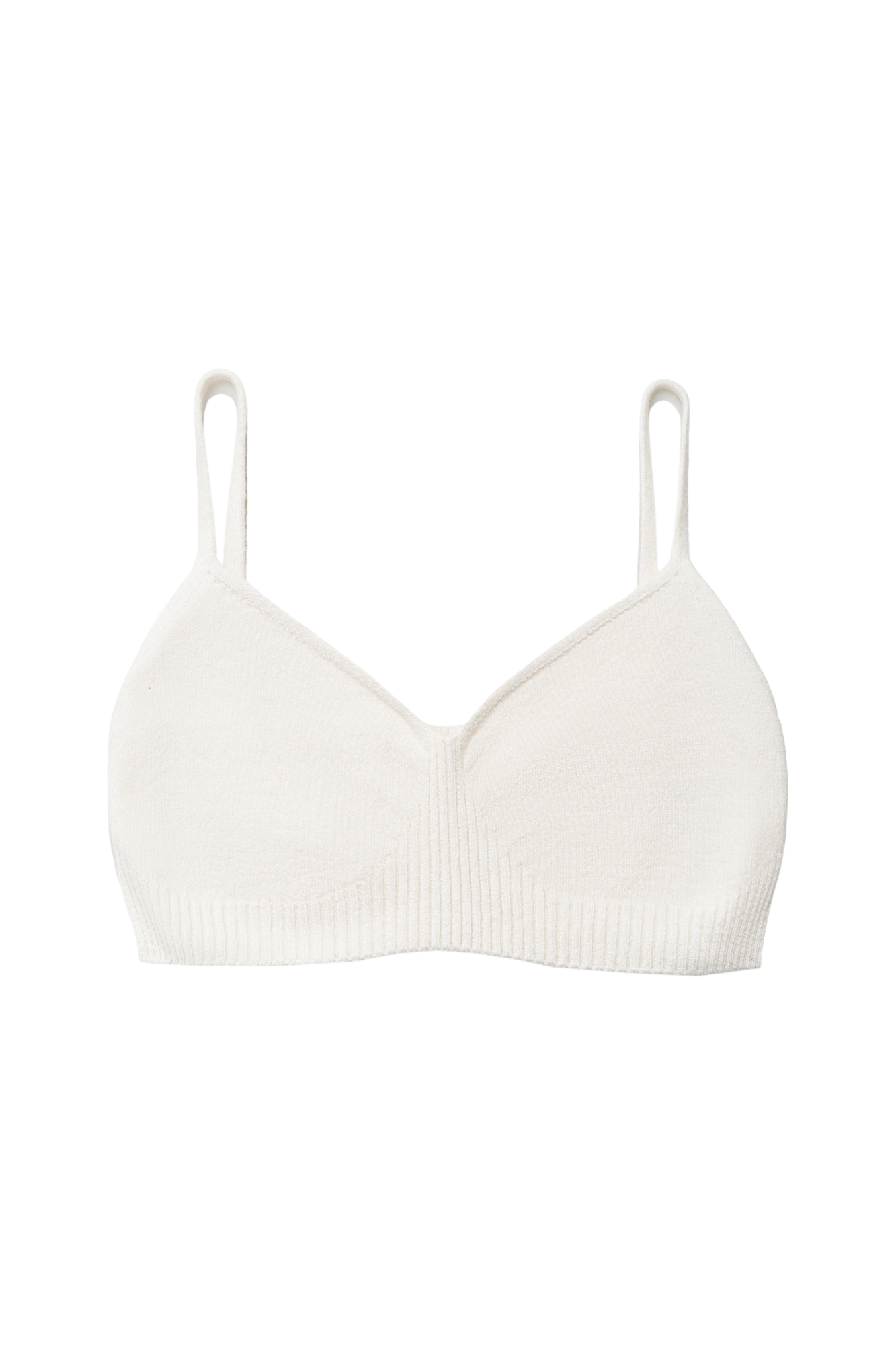 Базовый трикотажный топ, выполненный из кашемира и шерсти. Модель на тонких бретельках. вывязанными чашечками и эластичной резинкой в рубчик.