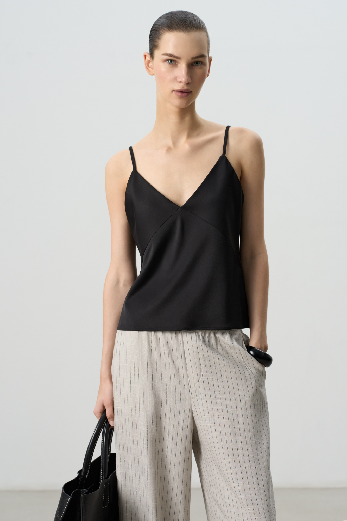 Атласный топ из тонкой вискозы. Модель прямого кроя, на тонких регулируемых бретелях и глубоким V-образным вырезом