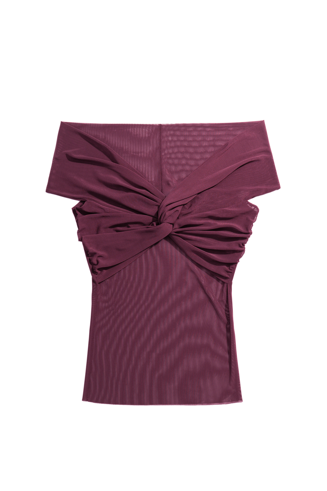 Полупрозрачный топ с открытой линией плеч. Модель приталенного силуэта, без рукавов. Изделие декорировано перекрутом на груди и драпировкой на лифе.
