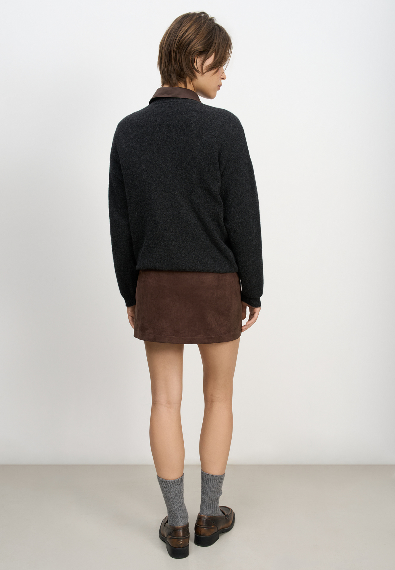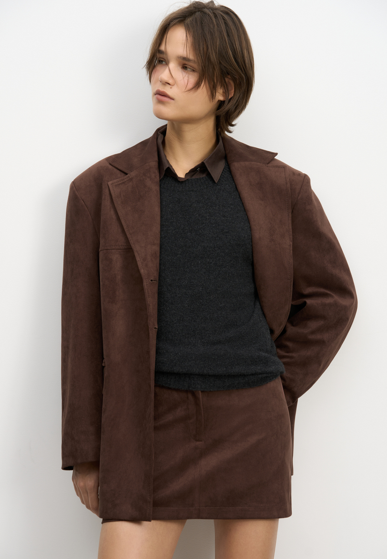 Юбка длины мини из ткани с имитацией внешнего вида и свойств натуральной замши. Застежка на скрытую пуговицу и молнию спереди.