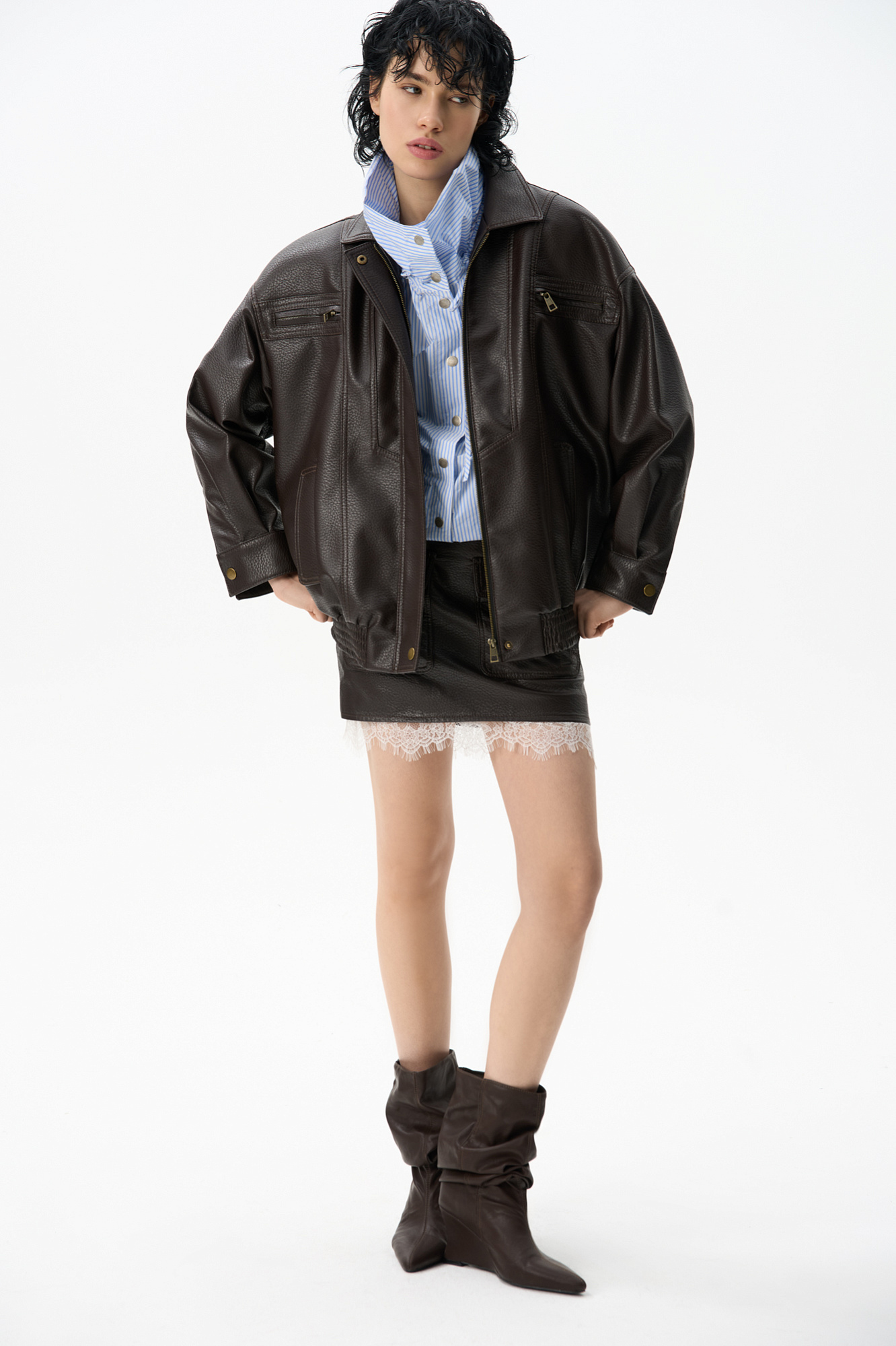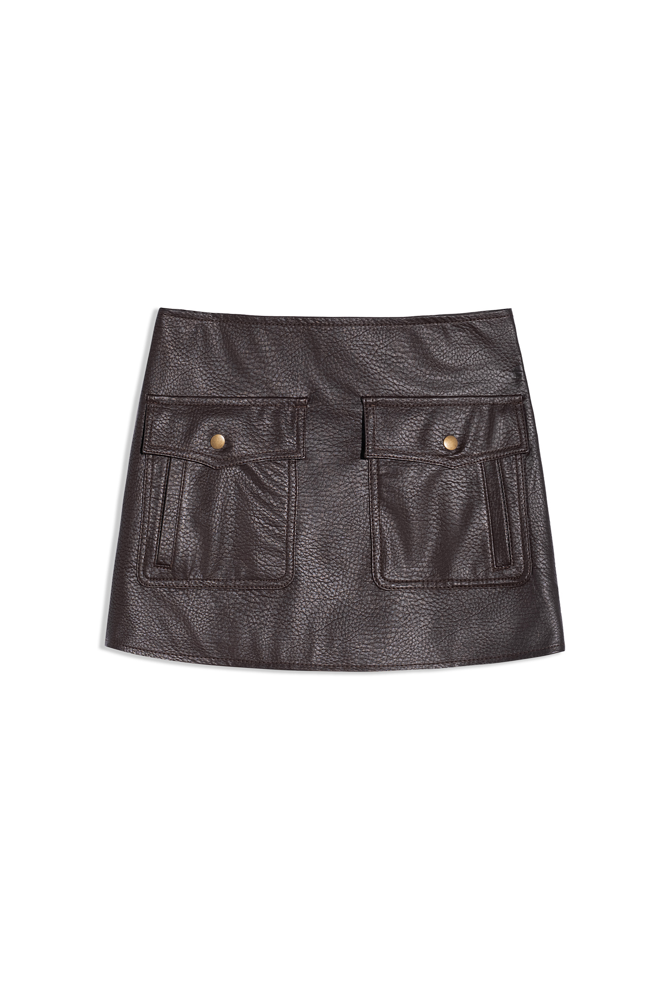 Юбка длины мини, выполненная из текстурной экокожи. Модель с двумя накладными карманами с клапанами спереди. Изделие на подкладке.