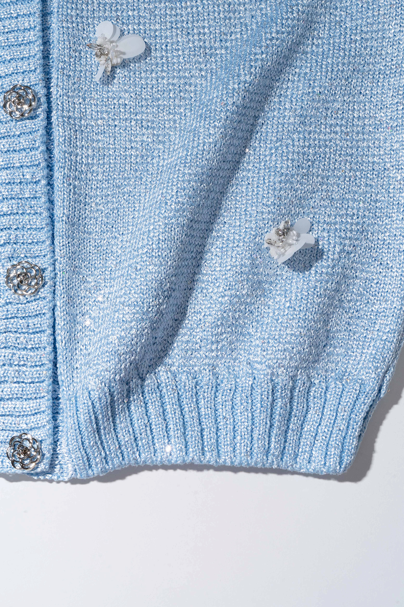 Трикотажный кардиган из вискозы и хлопка. Модель свободного силуэта, со спущенной линией плеч и круглым вырезом горловины. Застежка на пуговицы. Изделие декорировано маленькими пайетками и объемными цветами из бисера.