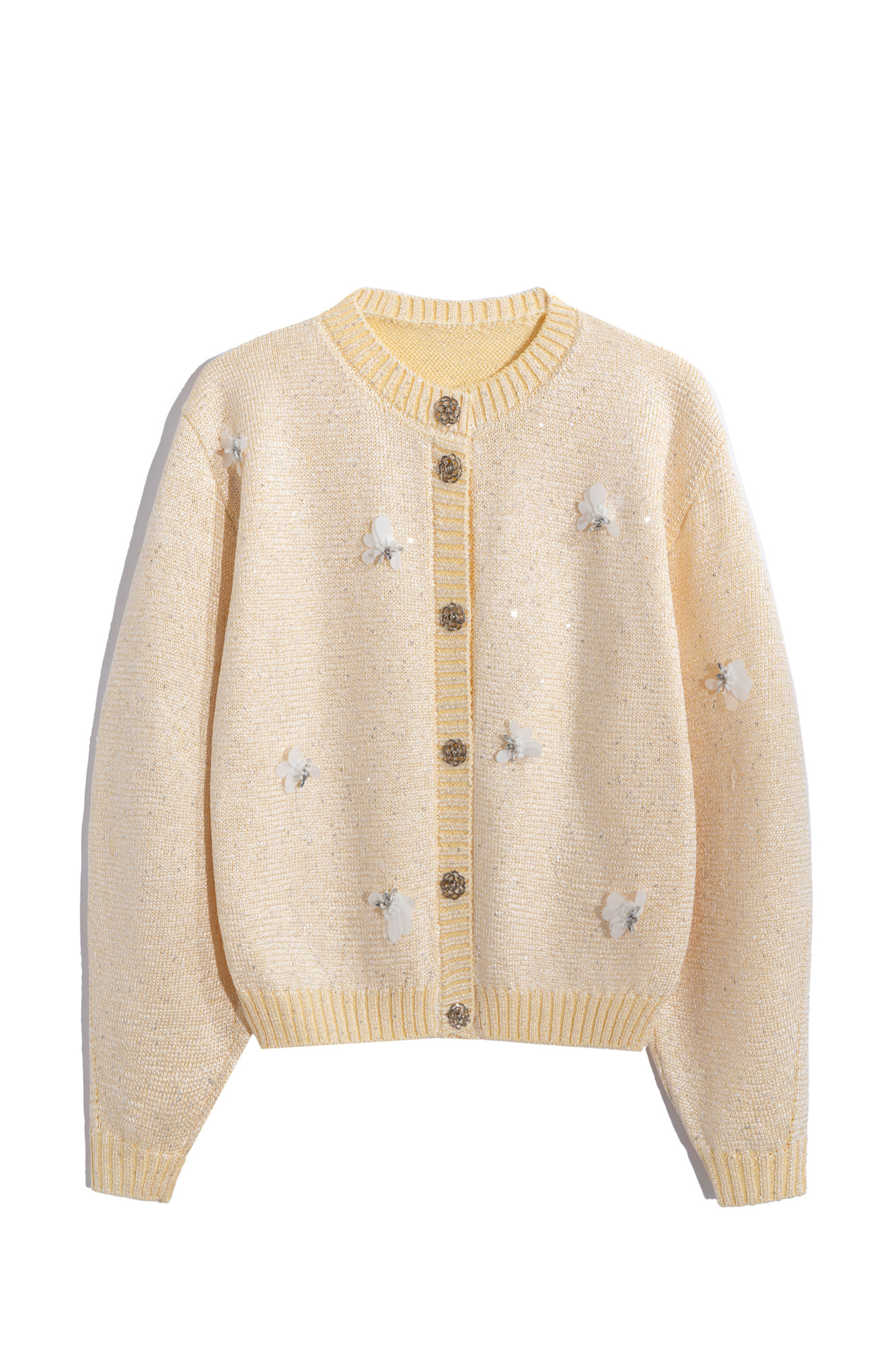 Трикотажный кардиган из вискозы и хлопка. Модель свободного силуэта, со спущенной линией плеч и круглым вырезом горловины. Застежка на пуговицы. Изделие декорировано маленькими пайетками и объемными цветами из бисера.